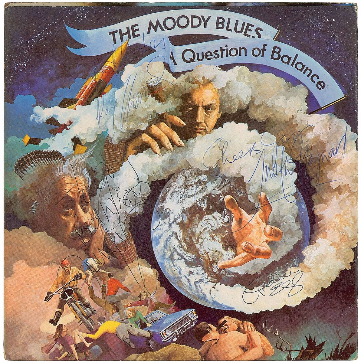 A Question of Balance album signed and inscribed on the front cover in blue and black ballpoint, “To Gary, Best wishes, John Lodge,” “Cheers Gary, Justin Hayward,” “Best Wishes, Ray Thomas,” and “Graeme Edge.” In fine condition. The record is included. Accompanied by a full letter of authenticity from REAL.