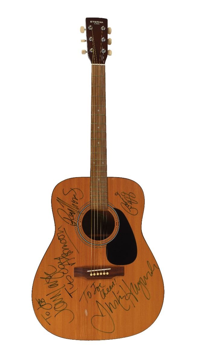 Natural finish Yamaha Eterna EF-10 right-handed acoustic guitar, signed and inscribed on the body in black felt tip, "To Joe, John Lodge, Tuesday Afternoon," "Ray Thomas," "Graeme Edge," and "To Joe, Cheers! Justin Hayward." Includes a ChromaCast gig bag. In fine condition.