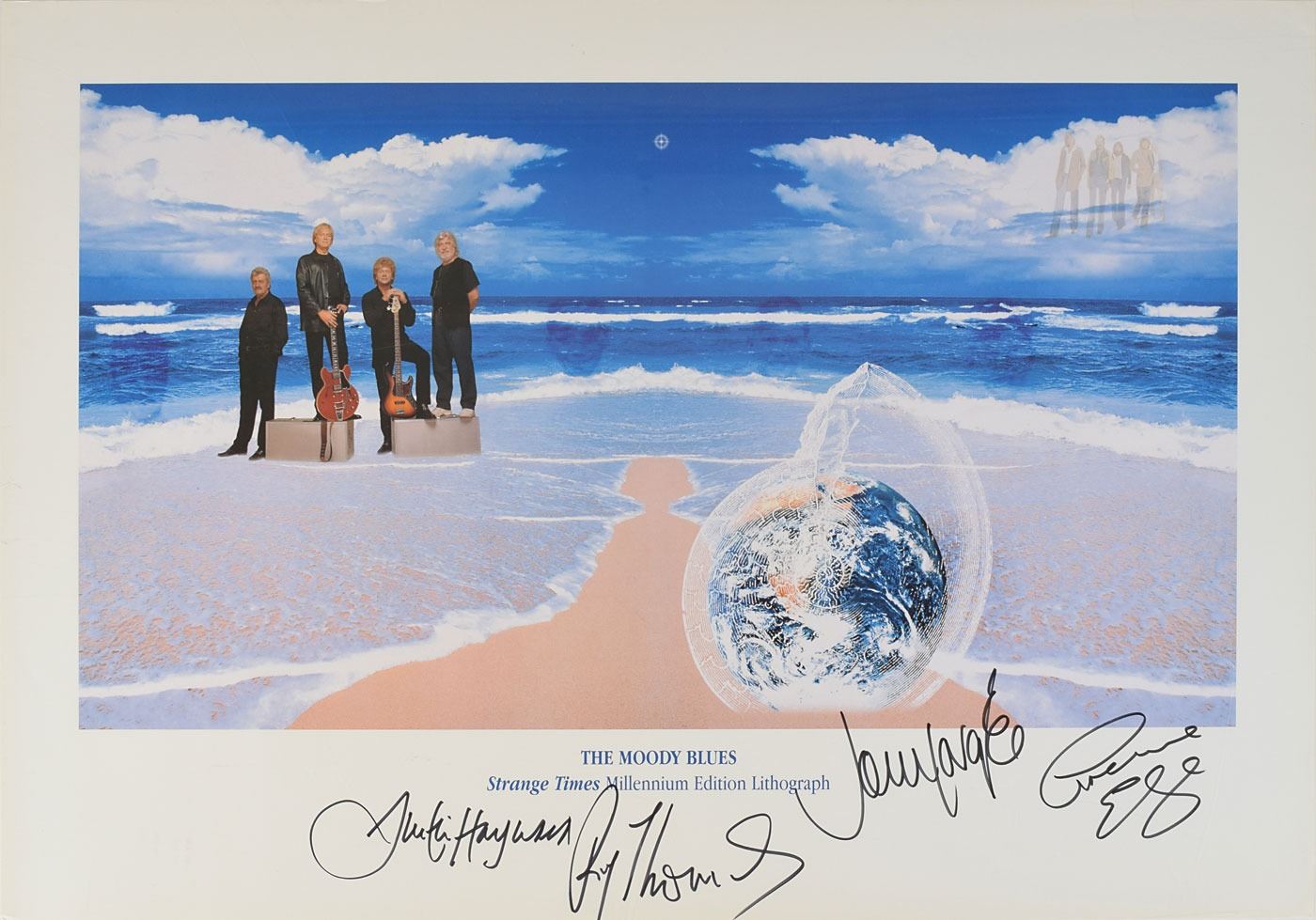 Appealing color 27 x 18 Millennium Edition lithograph for Strange Times, the fifteenth studio album by The Moody Blues, signed below in black felt tip by Justin Hayward, John Lodge, Ray Thomas, and Graeme Edge. Rolled and in fine condition.