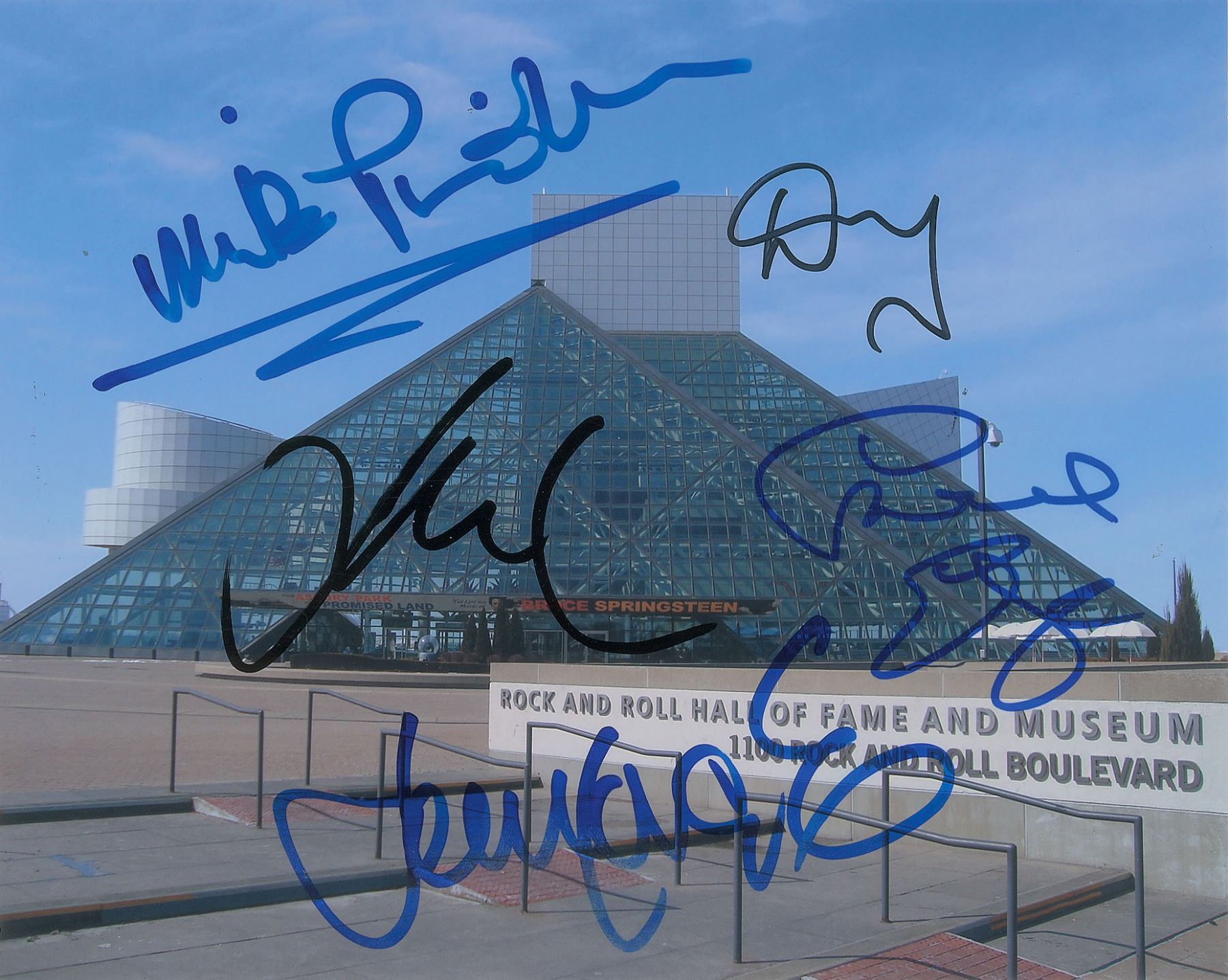 Color satin-finish 10 x 8 photo of the Rock and Roll Hall of Fame in Cleveland, Ohio, signed in blue or black felt tip by five members of the Moody Blues, including: Graeme Edge, Justin Hayward, John Lodge, Denny Laine, and Mike Pinder. In fine condition, with a small surface crease to the right side. Consignor notes that the signatures were obtained at the Westin Hotel in Cleveland during the 2018 Rock and Roll Hall of Fame induction weekend.