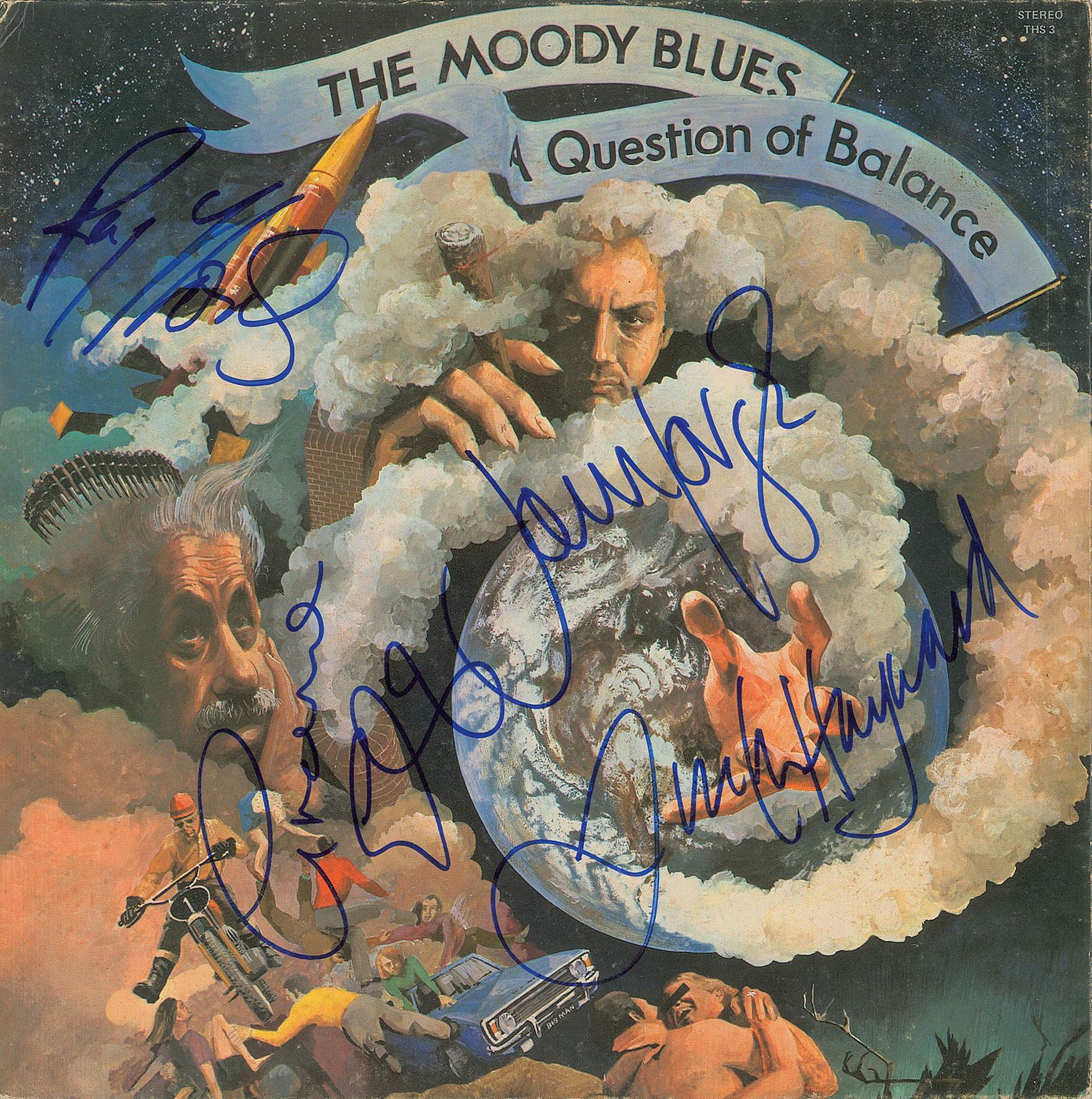 A Question of Balance album signed on the front cover in blue felt tip by Justin Hayward, John Lodge, Ray Thomas, and Graeme Edge. In fine condition, with some old price sticker residue. The record is not included.