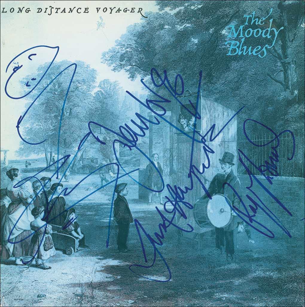 Long Distance Runner album signed on the front cover in blue felt tip by Justin Hayward, Ray Thomas, John Lodge, and Graeme Edge. In fine condition. The record is included.