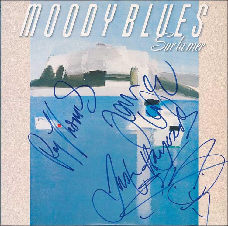 Sur la mer album signed on the front cover in blue felt tip by Justin Hayward, Ray Thomas, and Graeme Lodge. In fine condition. The record is included. Pre-certified Roger Epperson/REAL and RRAuction COA.