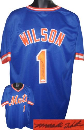 Mookie"Wilson is best remembered as the Met that hit the ground ball that trickled through Bill Buckner's legs in the bottom of the tenth inning of game six of the 1986 World Series. A switch hitter with excellent speed, his positive attitude and hustle immediately endeared him to a New York Mets fan base with precious few stars to root for when he first came up in the early 1980s. He was enshrined in the New York Mets Hall of Fame in 1996. Mookie Wilson New York Mets has hand signed this unlicensed TB custom-prostyle Blue jersey with twill stitched nameplate and numbers. JSA Hologram and Certificate of Authenticity.