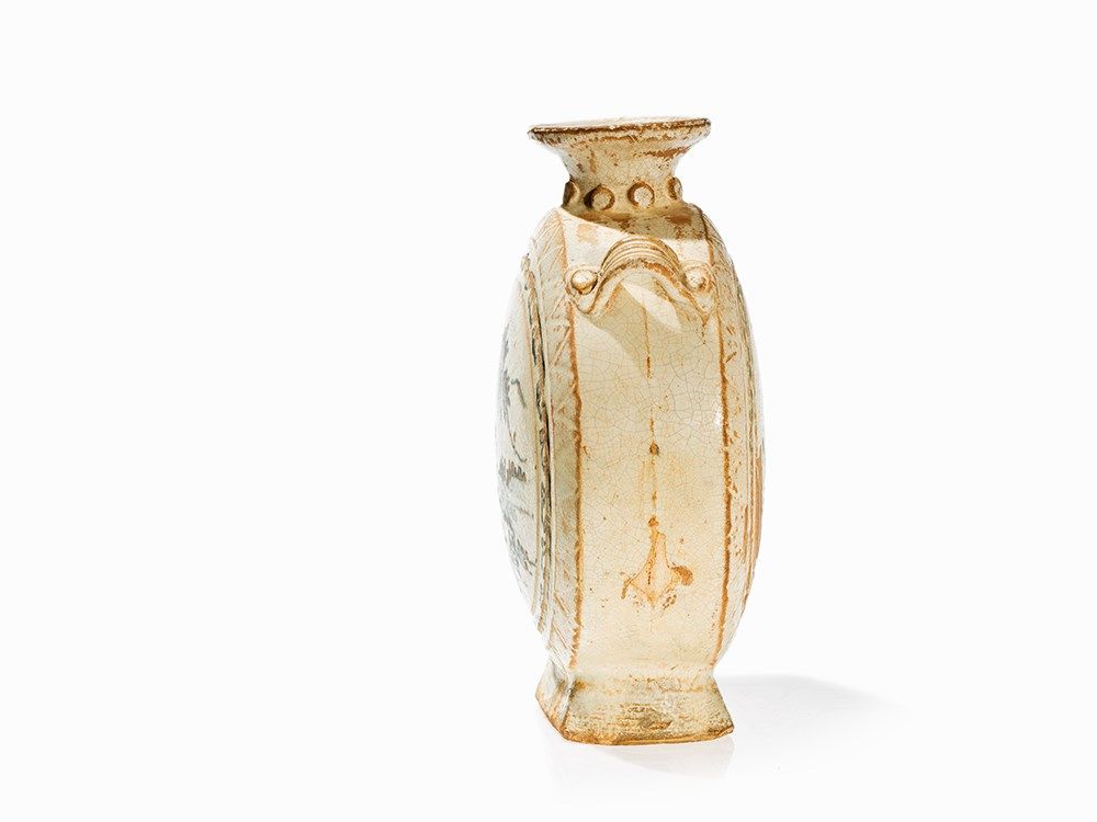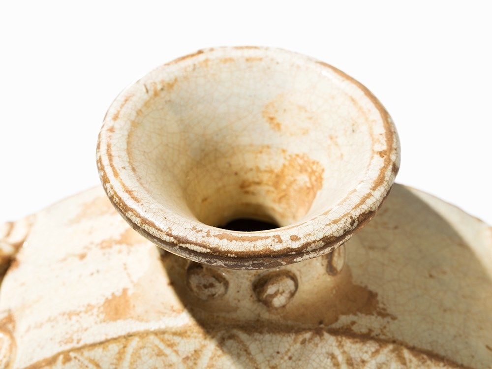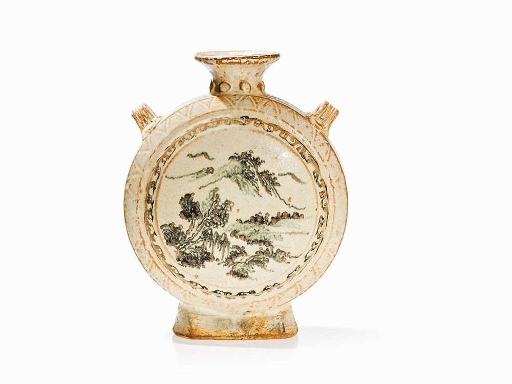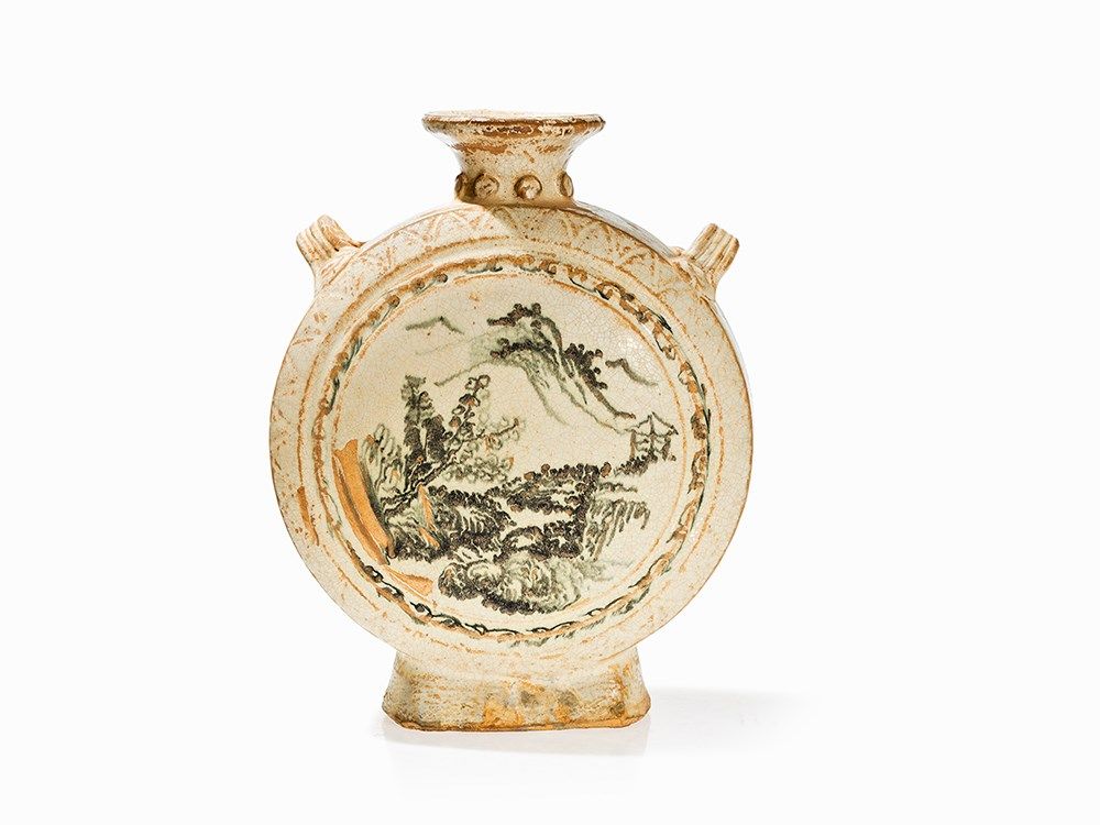 Flasks of this kind – round like the moon, hence the name ‘moonflask’ –are also known as a baoyueping or bianhu in Chinese. Their shape was inspired by Middle Eastern water flasks carried by travelers, hence they are also known as a ‘pilgrim’s flask’ in the West.