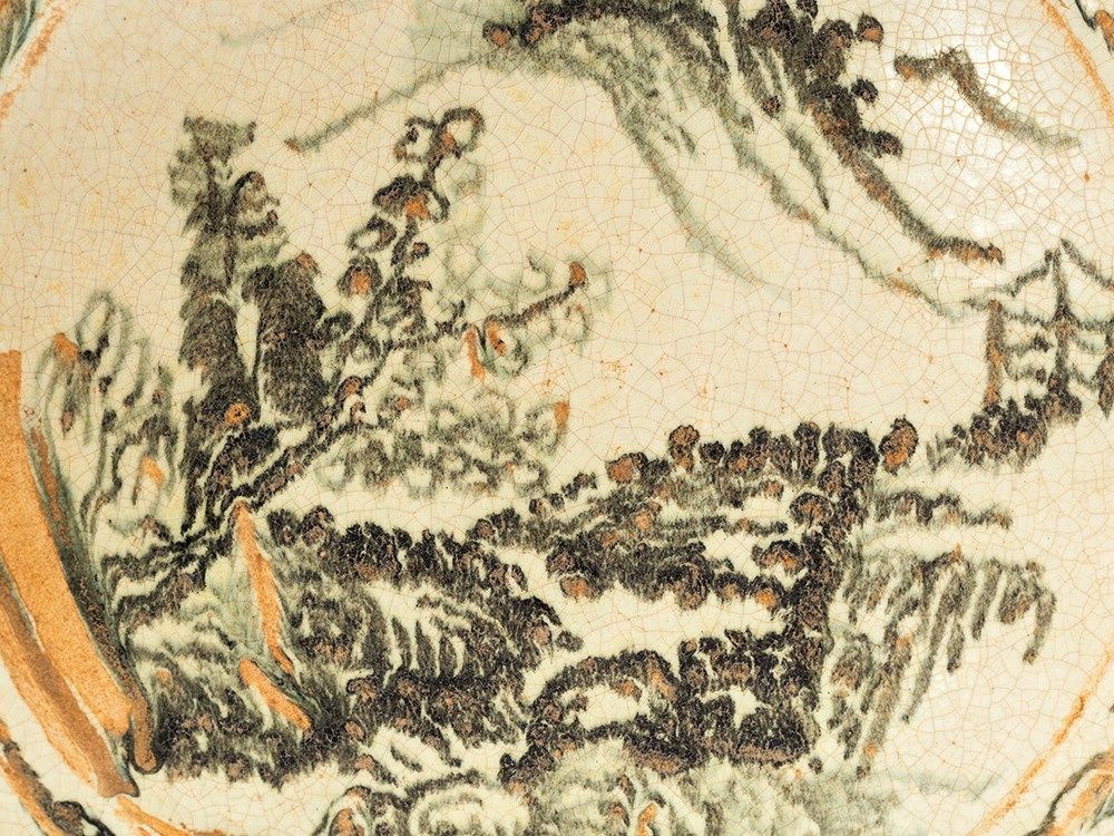 Both sides with delicatel landscape painting in very dark green, framed by a petal border in relief