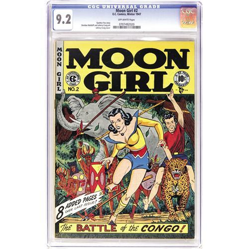 <B>Moon Girl #2 (EC, 1947) CGC NM- 9.2 Off-white pages.</B></I> We had never seen this book in high grade before, and in fact the two 9.2 copies on CGC's census are the only unrestored copies that CGC has certified as of this writing. This outing for EC's only superheroine has a Johnny Craig cover, with interior art by Craig as well as by Moon Girl's creator Sheldon Moldoff. Overstreet 2006 NM- 9.2 value = $720. CGC census 5/06: 2 in 9.2, none higher. <BR><BR><B>Important notice:</B> Heritage usually auctions material at the rate of 200-250 lots per hour. On some occasions eBay Live bid software or the Internet may not be able to keep up with the pace of the auction. We recommend placing a realistic absentee bid now as insurance to avoid disappointment. Occasionally the auctioneer may eliminate or reject an eBay Live bid, and the auctioneer may also reopen a lot after the close of the eBay live bidding (usually because we missed an audience bid), and may reject your bid even if it shows you as the winning bidder. By bidding via eBay Live, you agree that Heritage may award the lot to another bidder at its sole discretion under the circumstances described above or any other reasonable circumstances. Since eBay bids are not shown to us until we open the lot on the floor, we treat those bids just like floor bids. In most cases the floor responds before the eBay bid is presented to us, due to Internet lag time, so for consistency we have made it a policy that floor bids are always considered first over tie eBay live bids. Also please note that all Heritage lots purchased through eBay Live carry a 22.5% Buyer's Premium. Please make sure you read the Terms and Conditions before you bid. This lot is being auctioned in conjunction with a live floor auction by Heritage Auction Galleries. All final auction and invoice information will be supplied by Heritage Auction Galleries, and all other information should be considered preliminary. Lot:41001 <BR><BR><B>Winning Notification and Billing:</B> After the FINAL session in this auction is complete, Heritage will send e-mail and snail mail invoices. This process normally takes several days. All final auction and invoice information will be supplied by Heritage Auction Galleries, and all other information should be considered preliminary. <BR><BR>This auction will be conducted on a live auction floor and over the Internet through eBay Live. If you choose to place an absentee bid, please take a moment to <font color='#0000ff'><u><a href='http://pages.ebay.com/liveauctions/help/before/laabsentee.html'>learn how eBay Live absentee bidding works</a></u></font><font color='#000000'>