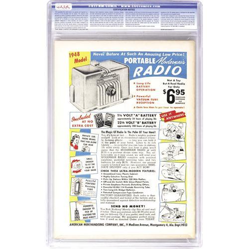 48C. COMICS – Comic books sold referencing a third-party grading service are sold "as is" without any express or implied warranty. Certain warranties may be available from the grading services and the Bidder is referred to them for further details: Comics Guaranty Corporation (CGC), P.O. Box 4738, Sarasota, FL 34230. Subject to sections 57 and 58, bidders who intend to challenge authenticity or provenance of a lot must notify Auctioneer in writing within thirty (30) days of the Auction's conclusion. Auctioneer's maximum liability shall not exceed the high bid on that lot, which bid shall be deemed for all purposes the value of the lot. In the event Auctioneer cannot deliver the lot or subsequently it is established that the lot lacks title, provenance, authenticity, or other transfer or condition issue is claimed, Auctioneer's liability shall be limited to recission of sale and refund of purchase price. After one year has elapsed, Auctioneer's maximum liability shall be limited to any commissions and fees Auctioneer earned on that lot.