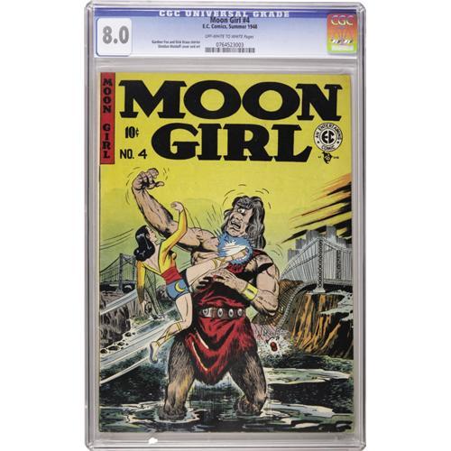 <B>Moon Girl #4 (EC, 1948) CGC VF 8.0 Off-white to white pages.</B></I> The early EC book had a definite DC "feel" with Gardner Fox scripting and Sheldon Moldoff drawing both the cover and the interior. We've only offered this issue a few times previously, and never at this high of a grade. Fact is, CGC hasn't given out a grade higher than VF/NM 9.0 for this issue to date! Overstreet 2006 VF 8.0 value = $293. CGC census 10/06: 1 in 8.0, 1 higher.<BR><BR><b>Shipping:</b> Slabbed Comic (<a target="_blank" href="http://www.heritageauctions.com/common/shipping.php">view shipping information</a>)