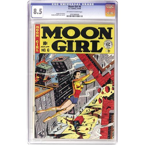 <B>Moon Girl #6 (EC, 1949) CGC VF+ 8.5 Off-white to white pages.</B></I> Sheldon Moldoff provided both cover and interior art for this issue, a book rated "scarce" by both Gerber and Overstreet. Overstreet 2006 VF 8.0 value = $338; VF/NM 9.0 value = $529. CGC census 5/06: 3 in 8.5, 2 higher. <BR><BR><B>Important notice:</B> Heritage usually auctions material at the rate of 200-250 lots per hour. On some occasions eBay Live bid software or the Internet may not be able to keep up with the pace of the auction. We recommend placing a realistic absentee bid now as insurance to avoid disappointment. Occasionally the auctioneer may eliminate or reject an eBay Live bid, and the auctioneer may also reopen a lot after the close of the eBay live bidding (usually because we missed an audience bid), and may reject your bid even if it shows you as the winning bidder. By bidding via eBay Live, you agree that Heritage may award the lot to another bidder at its sole discretion under the circumstances described above or any other reasonable circumstances. Since eBay bids are not shown to us until we open the lot on the floor, we treat those bids just like floor bids. In most cases the floor responds before the eBay bid is presented to us, due to Internet lag time, so for consistency we have made it a policy that floor bids are always considered first over tie eBay live bids. Also please note that all Heritage lots purchased through eBay Live carry a 22.5% Buyer's Premium. Please make sure you read the Terms and Conditions before you bid. This lot is being auctioned in conjunction with a live floor auction by Heritage Auction Galleries. All final auction and invoice information will be supplied by Heritage Auction Galleries, and all other information should be considered preliminary. Lot:41001 <BR><BR><B>Winning Notification and Billing:</B> After the FINAL session in this auction is complete, Heritage will send e-mail and snail mail invoices. This process normally takes several days. All final auction and invoice information will be supplied by Heritage Auction Galleries, and all other information should be considered preliminary. <BR><BR>This auction will be conducted on a live auction floor and over the Internet through eBay Live. If you choose to place an absentee bid, please take a moment to <font color='#0000ff'><u><a href='http://pages.ebay.com/liveauctions/help/before/laabsentee.html'>learn how eBay Live absentee bidding works</a></u></font><font color='#000000'>