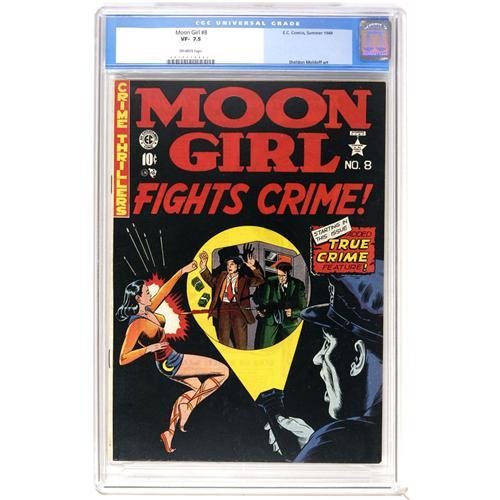<B>Moon Girl #8 (EC, 1949) CGC VF- 7.5 Off-white pages.</B></I> "Scarce" according to both Gerber and Overstreet. Cover reads <B>Moon Girl Fights Crime!</B></I>. Sheldon Moldoff cover and art. Overstreet 2006 VF 8.0 value = $338. CGC census 5/06: 1 in 7.5, 1 higher. <BR><BR><B>Important notice:</B> Heritage usually auctions material at the rate of 200-250 lots per hour. On some occasions eBay Live bid software or the Internet may not be able to keep up with the pace of the auction. We recommend placing a realistic absentee bid now as insurance to avoid disappointment. Occasionally the auctioneer may eliminate or reject an eBay Live bid, and the auctioneer may also reopen a lot after the close of the eBay live bidding (usually because we missed an audience bid), and may reject your bid even if it shows you as the winning bidder. By bidding via eBay Live, you agree that Heritage may award the lot to another bidder at its sole discretion under the circumstances described above or any other reasonable circumstances. Since eBay bids are not shown to us until we open the lot on the floor, we treat those bids just like floor bids. In most cases the floor responds before the eBay bid is presented to us, due to Internet lag time, so for consistency we have made it a policy that floor bids are always considered first over tie eBay live bids. Also please note that all Heritage lots purchased through eBay Live carry a 22.5% Buyer's Premium. Please make sure you read the Terms and Conditions before you bid. This lot is being auctioned in conjunction with a live floor auction by Heritage Auction Galleries. All final auction and invoice information will be supplied by Heritage Auction Galleries, and all other information should be considered preliminary. Lot:41001 <BR><BR><B>Winning Notification and Billing:</B> After the FINAL session in this auction is complete, Heritage will send e-mail and snail mail invoices. This process normally takes several days. All final auction and invoice information will be supplied by Heritage Auction Galleries, and all other information should be considered preliminary. <BR><BR>This auction will be conducted on a live auction floor and over the Internet through eBay Live. If you choose to place an absentee bid, please take a moment to <font color='#0000ff'><u><a href='http://pages.ebay.com/liveauctions/help/before/laabsentee.html'>learn how eBay Live absentee bidding works</a></u></font><font color='#000000'>