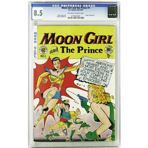 <B>Moon Girl and the Prince #1 (EC, 1947) CGC VF+ 8.5 Off-white to white pages.</B></I> No copy of this pre-Trend EC has been graded higher by CGC to date! And no true-blue EC fan could fail to be fascinated by the one and only superhero series the company produced. As to the "why," they had the services of Sheldon Moldoff! When Moldoff got his discharge from the armed forces, he re-established contact with his old boss from the All-American Comics days, M. C. Gaines, and this first issue resulted. Alas, 1947 wasn't exactly the most auspicious time to launch new superheroes, and the title quickly metamorphosed into <B>Moon Girl Fights Crime!</B></I>. This first issue has the heroine's origin and boasts a cover by Johnny Craig (in quite a different style than his later work). Overstreet 2006 VF 8.0 value = $600; VF/NM 9.0 value = $950. CGC census 1/06: 2 in 8.5, none higher.