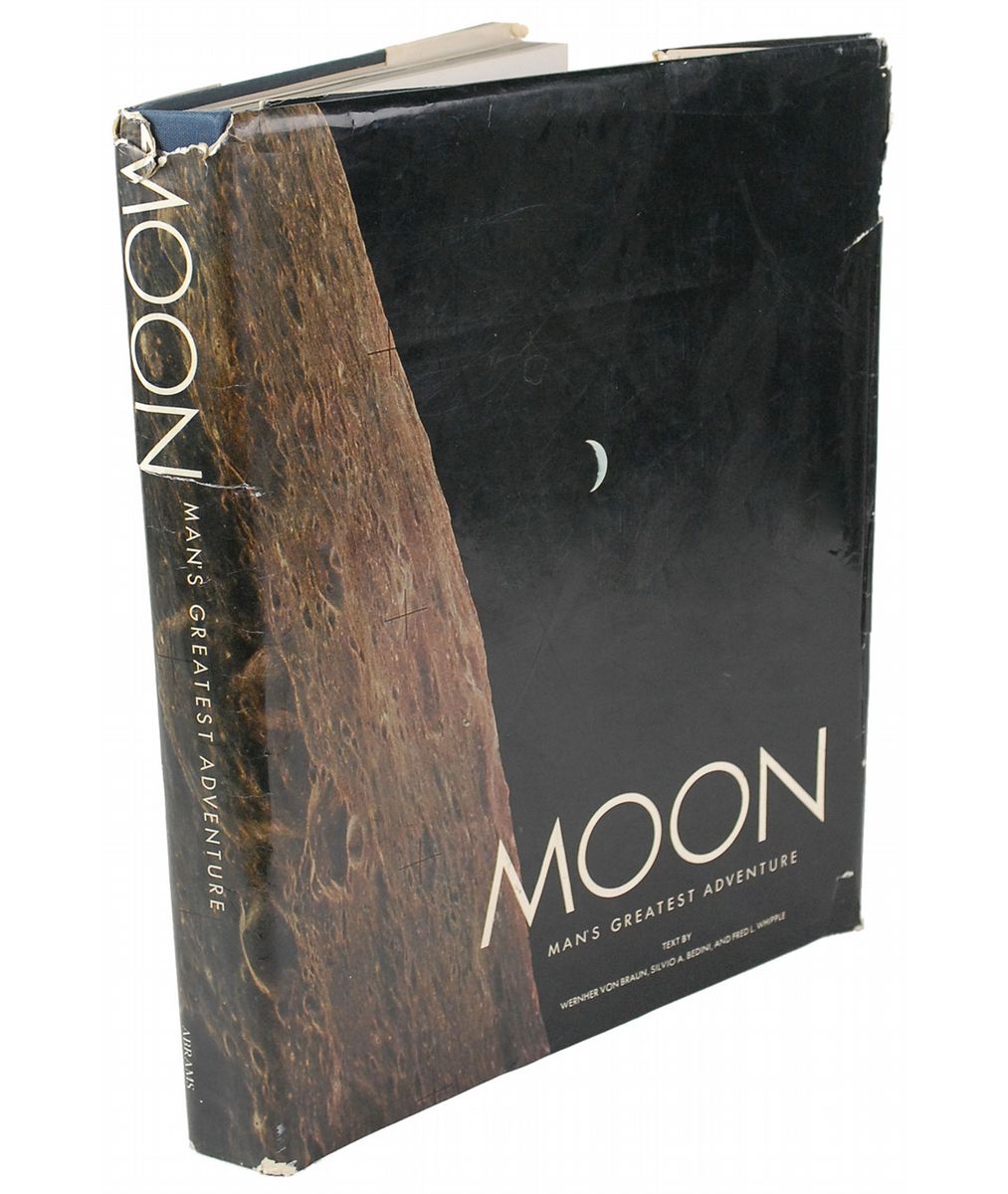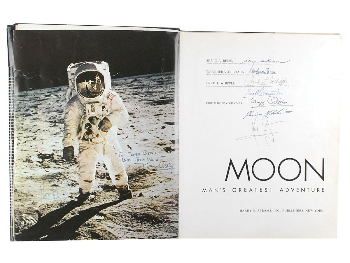 Signed book: Moon: Man’s Greatest Adventure. NY: Harry N. Abrams, 1970. Hardcover with dust jacket, 12.5 x 15.5, 267 pages. Signed on the title page in ink and felt tip by Neil Armstrong, Buzz Aldrin, Harrison Schmitt, and Scott Carpenter, and by authors Wernher von Braun, Silvio A. Bedini, and Fred L. Whipple. Adjacent page features a large color image of Aldrin on the lunar surface, taken by Neil Armstrong, signed in blue ballpoint by Armstrong, and signed and inscribed ink black ink, “To Floyd Bekins, with best wishes, Buzz Aldrin.” Autographic condition: a few creases and edge tears to the detached signed pages, otherwise fine condition. Book condition: G-/G+. Book originates from the estate of Floyd R. Bekins, a member of the Bekins Van and Storage family, who was also interested in mining and geology and did some work for NASA. Several slips of paper are tucked into specific pages of the book which bear notations by Bekins identifying elements and minerals he believed to be present in the photos. An impressive piece linking the father of rocket science with the first two moonwalkers.