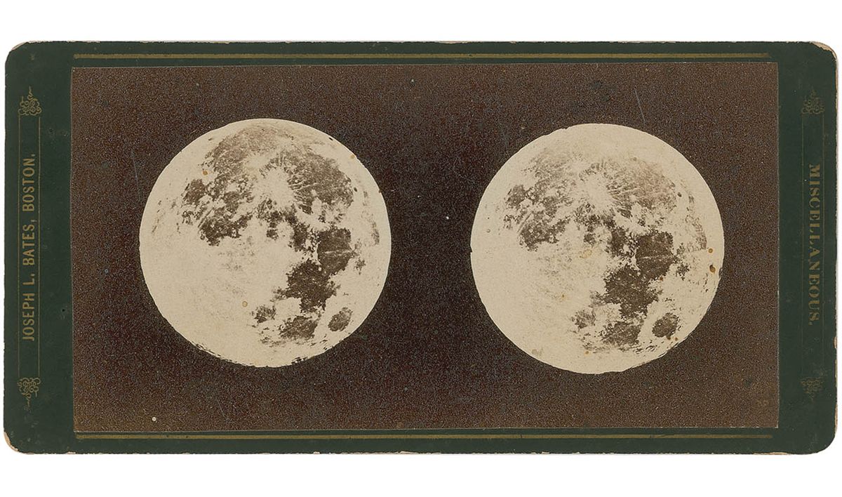 An unusual pair of lunar stereoviews, 6.75 x 3.5, each showing twin images of the moon, one published by Joseph L. Bates of Boston, with the other having no photographer’s credit, but bearing a two-cent revenue stamp on the reverse. In fine condition, with light silvering to both images.