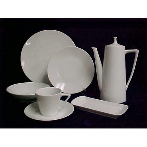 The Moonglow pattern (#3900) by Harmony House China is solid white and was discontinued around 1965. This 36-piece set includes one 8 1/4" coffee pot with lid, one 7-1/2" butter dish (no lid), six 10-1/4" dinner plates, six 7-1/2" salad plates, six 6-1/2" cereal bowls, and six cup and saucer sets. All pieces are in very good condition with the exception of a smudge mark (manufacturer defect) on one cereal bowl. The year made is unknown.