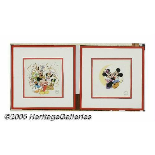 <B>""Moonlight Romance"" and ""Party Time"" Limited Edition Sericel (The Walt Disney Company, 1994-95).</B></I> ""Moonlight Romance"" features Mickey and Minnie embracing in the romantic light of a crescent moon, and ""Party Time"" features Mickey, Minnie, Goofy, and Pluto jovially celebrating a festive occasion with streamers and confetti. Limited to an edition of 7,500 each, these sericels have an image area measuring 6.5"" x 6.5"". Both are in Excellent condition, and each includes a certificate of authenticity. <BR><BR><B>Important notice:</B> Heritage usually auctions material at the rate of 200-250 lots per hour. On some occasions eBay Live bid software or the Internet may not be able to keep up with the pace of the auction. We recommend placing a realistic absentee bid now as insurance to avoid disappointment. Occasionally the auctioneer may eliminate or reject an eBay Live bid, and the auctioneer may also reopen a lot after the close of the eBay live bidding (usually because we missed an audience bid), and may reject your bid even if it shows you as the winning bidder. By bidding via eBay Live, you agree that Heritage may award the lot to another bidder at its sole discretion under the circumstances described above or any other reasonable circumstances. Since eBay bids are not shown to us until we open the lot on the floor, we treat those bids just like floor bids. In most cases the floor responds before the eBay bid is presented to us, due to Internet lag time, so for consistency we have made it a policy that floor bids are always considered first over tie eBay live bids. Also please note that all Heritage lots purchased through eBay Live carry a 20% Buyer's Premium. Please make sure you read the Terms and Conditions before you bid. This lot is being auctioned in conjunction with a live floor auction by Heritage Galleries & Auctioneers. All final auction and invoice information will be supplied by Heritage Galleries & Auctioneers, and all other information