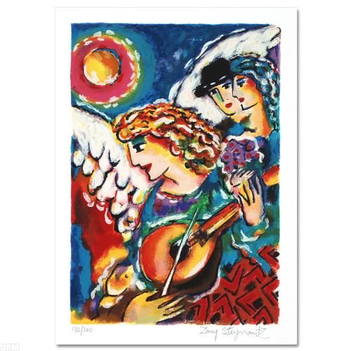 With bright colors and soft brushstrokes, Zamy Steynovitz (1951-2000) created feminine romanticized scenes with a playful nature. "Moonlight Serenade" is a limited edition serigraph on paper, numbered and hand signed by Steynovitz. This piece was acquired in a gallery close-out and there is no specific certificate information available. Measures approx. 11" x 15" (with border), 9" x 13" (image).