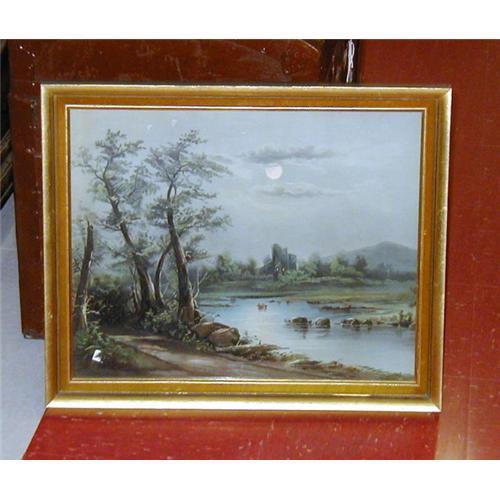 Lovely moonlit outdoor scene of castle in background - people in a rowboat on a lake (hard to see in picture) and elegant trees on path. Frame is gold - 1-3/4" wide with black trim, but has some scratches, marks and wear. Buyer pays shipping and handling costs.