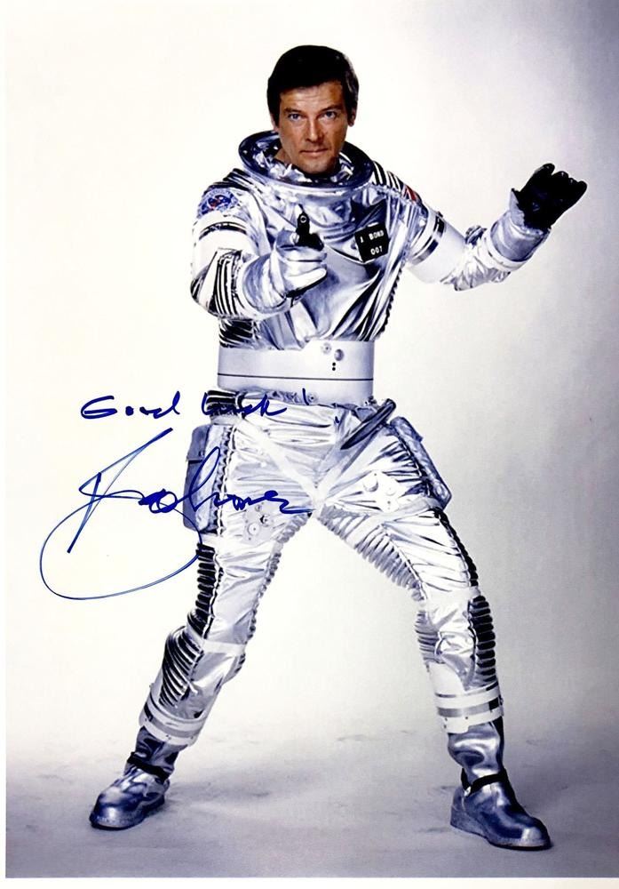 Moonraker facsimile signed movie photo autographed by Roger Moore. 8x10 inches. This item is a reprint of an original autograph