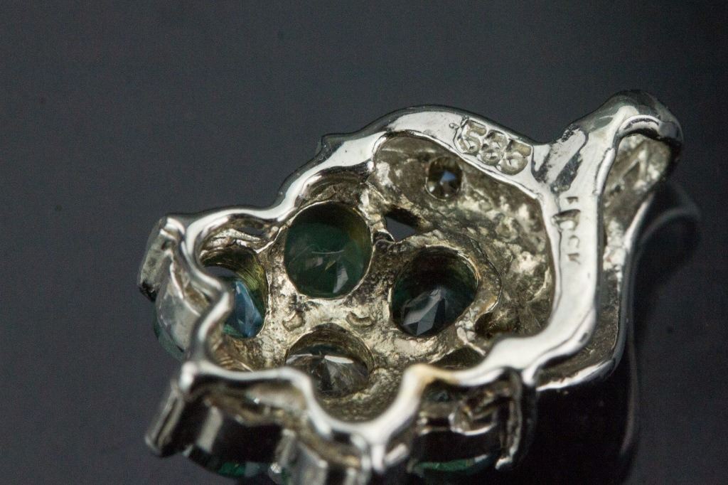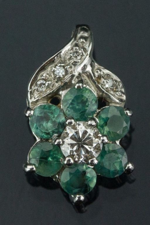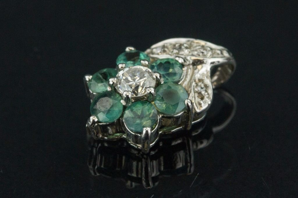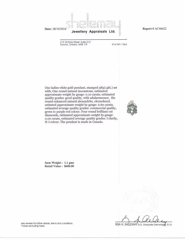 Stamped 14k white gold pendant; set with one 0.1 ct round natural moonstone, six 0.6 ct round enhanced natural alexandrite, and four 0.02 ct round brilliant cut dimonds; certified replacement value CAD$600; 1.1 grams
