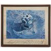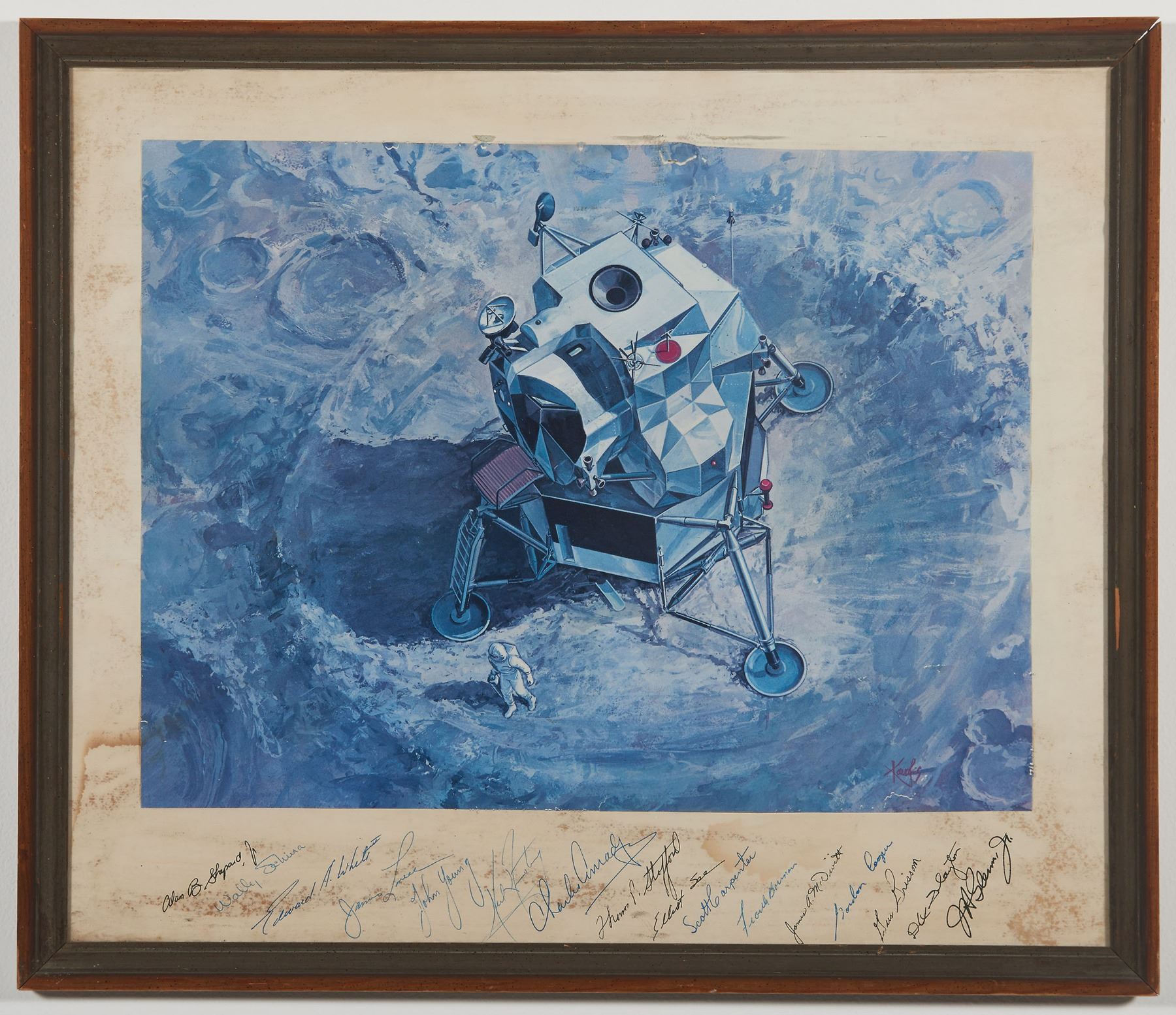 Extraordinary artwork signed by 14 NASA astronauts, including 5 of the Mercury 7 and all 9 from Astronaut Group 2. Astronauts sign on the mat below a print of a moonwalker: ''Alan B. Shepard, Jr.'', ''Edward A. White II'', ''James Lovell'', ''John Young'', ''Neil Armstrong'', ''Charles Conrad Jr.'', ''Thomas P. Stafford'', ''Elliot See'', ''Scott Carpenter'', ''Frank Borman'', ''James A. McDivitt'', ''Gordon Cooper'', ''DK Slayton'' and ''JH Glenn, Jr.'' Wally Schirra signature is autopen and Gus Grissom is secretarial. Visible portion of mat measures 22'' x 18.5''. Not examined out of frame. Mat has dampstaining, toning and some buckling, overall in good condition considering the bold quality of the signatures.