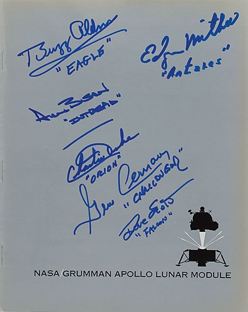 Scarce NASA/Grumman Apollo Lunar Module transgraphic brochure, 8 x 10, printed in Germany, circa 1967, for Grumman Aerospace Corporation, signed on the front cover in blue felt tip by six moonwalkers, representing one from each lunar landing: "Buzz Aldrin, 'Eagle,'" "Alan Bean, 'Intrepid,'" "Edgar Mitchell, 'Antares,'" "Dave Scott, 'Falcon,'" "Charlie Duke, 'Orion,'" and "Gene Cernan, 'Challenger.'" The booklet contains eight clear acetate sheets, each printed in color on both sides, stapled inside a gray folder with a fold-out flap on the back cover detailing the legend for the 118 numbered parts. In fine condition, with faint edge toning.