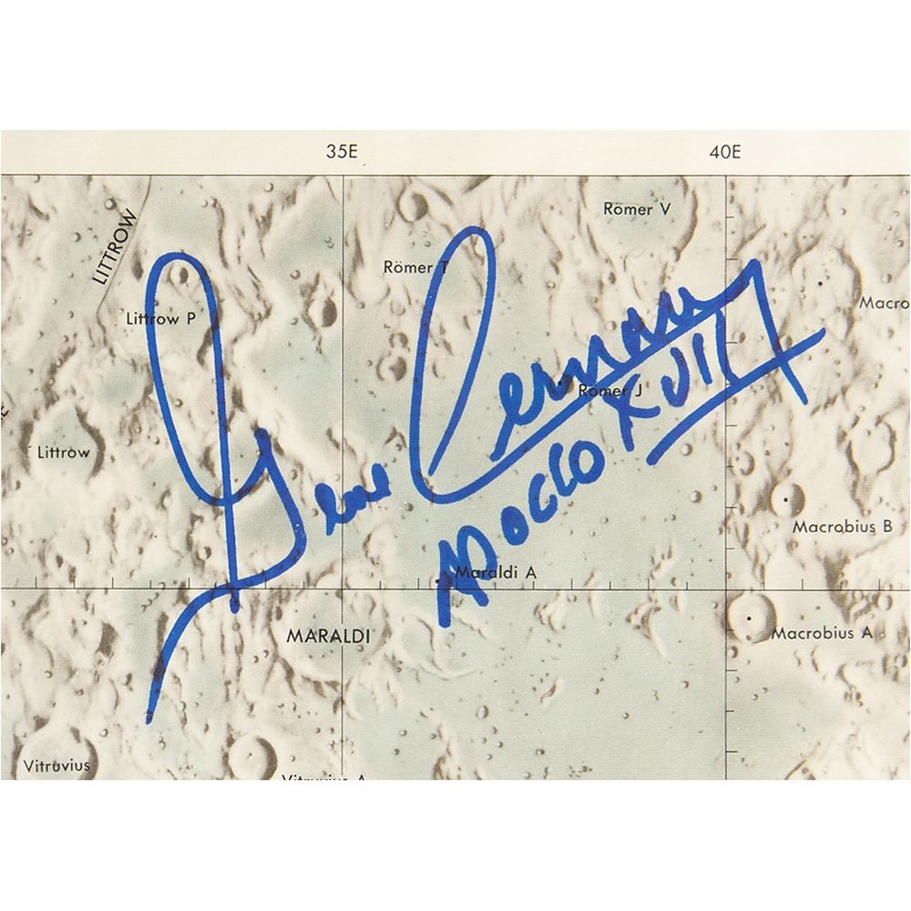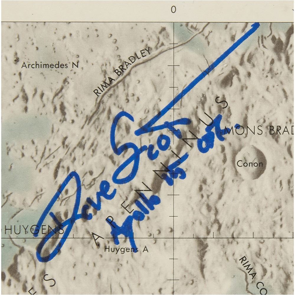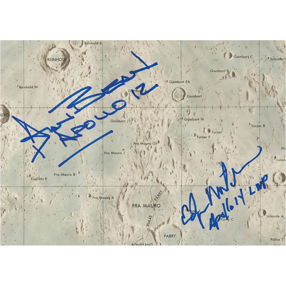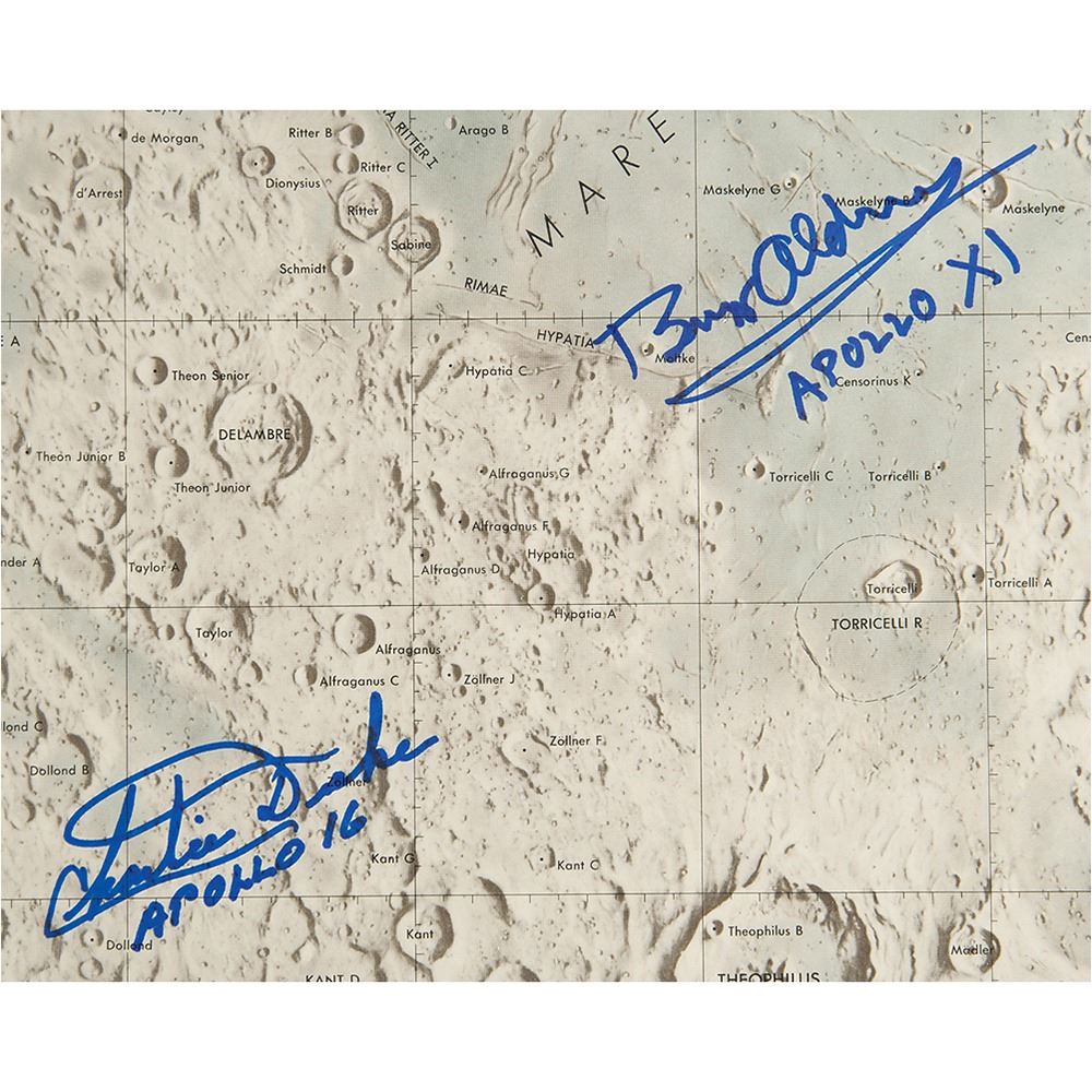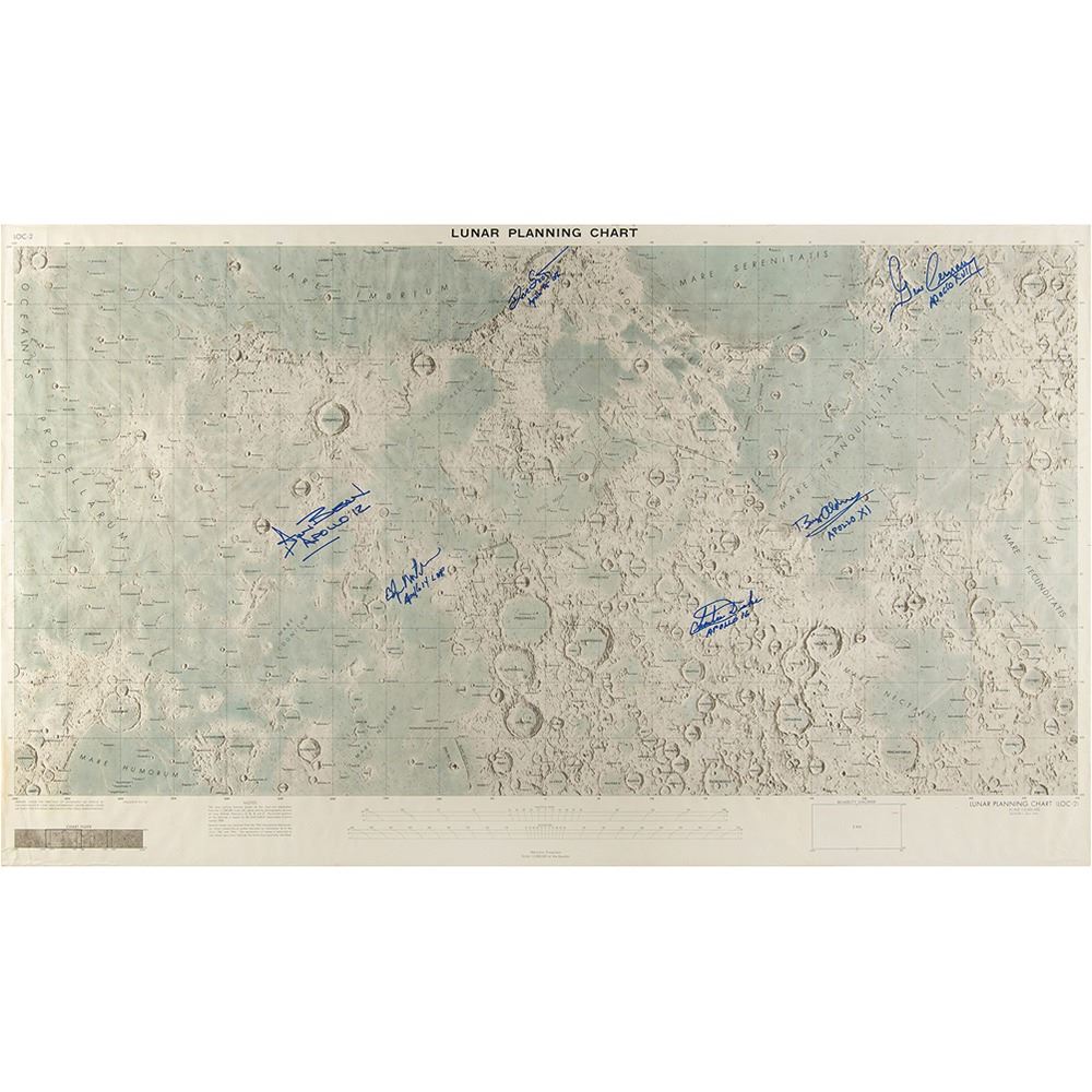 Highly desirable color first edition of a lunar map entitled "Lunar Planning Chart (LOC-2)," 48 x 29, prominently signed in blue felt tip by six moonwalkers: "Buzz Aldrin, Apollo XI," "Alan Bean, Apollo 12," "Edgar Mitchell, Apollo 14 LMP," "Dave Scott, Apollo 15 CDR," "Charlie Duke, Apollo 16," and "Gene Cernan, Apollo XVII." Prepared for NASA by the Air Force's Aeronautical Chart and Information Center, the chart was published in July 1969. In fine condition, with light overall creasing and a small tear to the lower left corner.