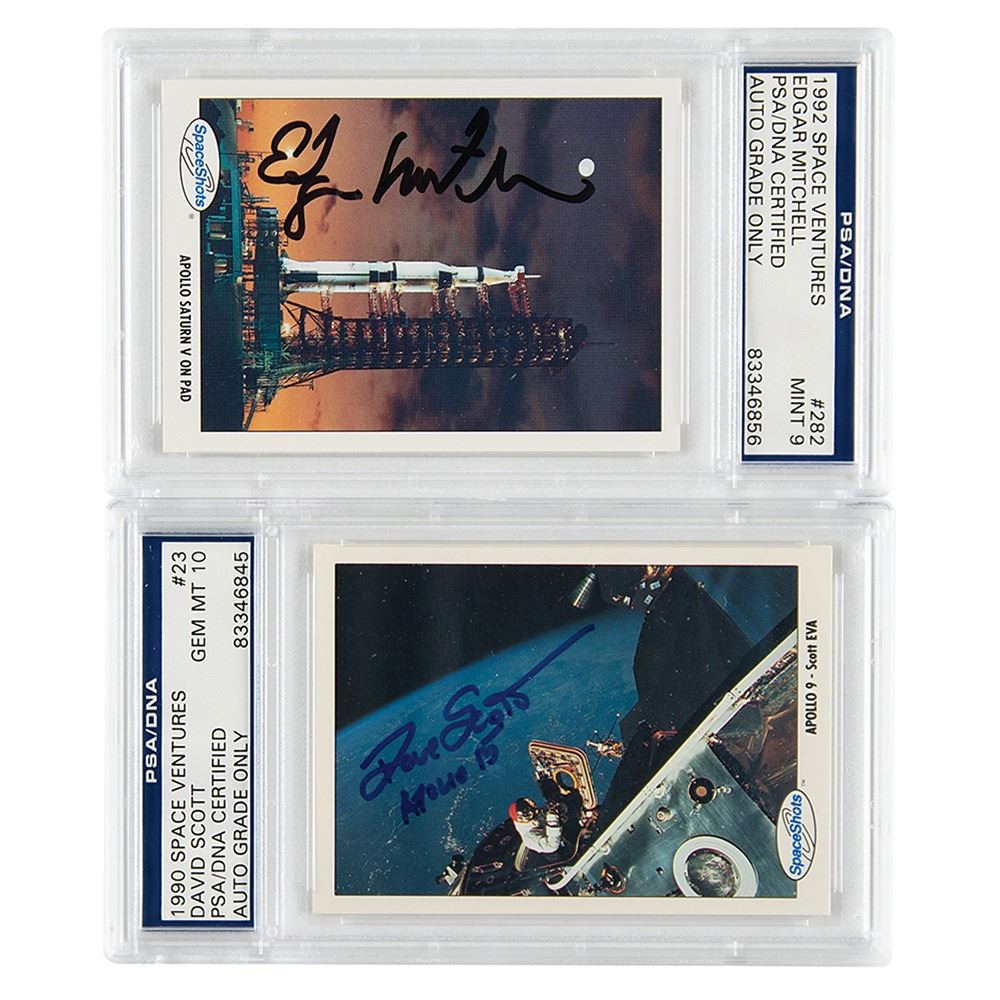 Group lot of seven Space Shots trading cards, each signed on the front in ink or felt tip by an Apollo moonwalker, all of which are encapsulated in PSA/DNA authentication holders, the majority of which are graded. The astronauts include Alan Bean, who adds “Apollo 12, Skylab†(NM 7), Gene Cernan (NM-MT 8), Charlie Duke, Jim Irwin, who adds “Apollo 15†with a crescent moon sketch, Edgar Mitchell (MINT 9), Harrison Schmitt (MINT 9), and Dave Scott, who adds “Apollo 15†(GEM MT 10). In overall fine condition.