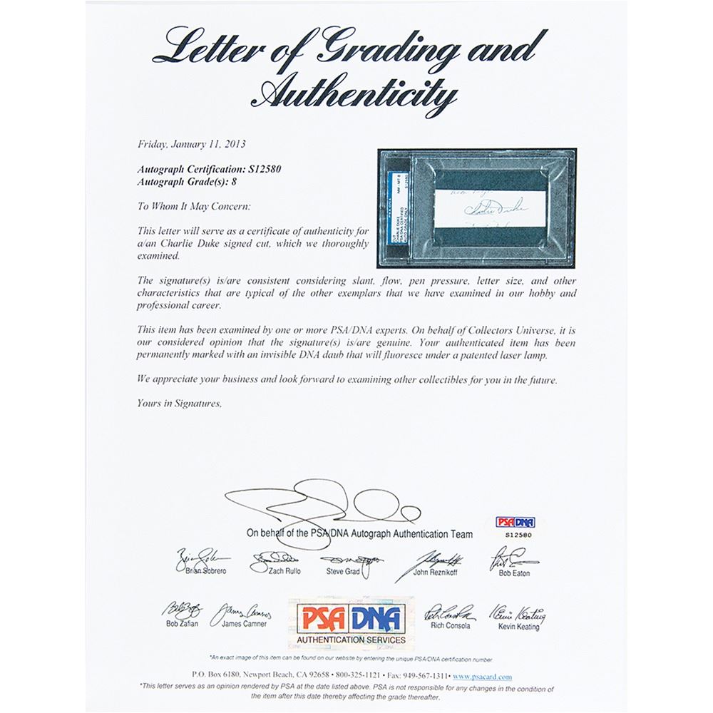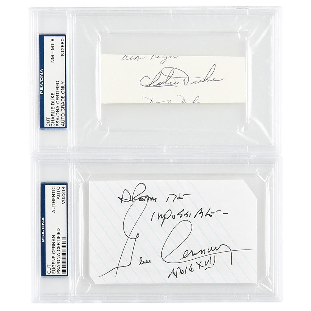 Ink signatures of two moonwalkers, “Dream the impossible, Gene Cernan, Apollo XVII†and “Charlie Duke,†on individual off-white sheets measuring 4.75 x 3 and 4 x 1.25. In overall very good to fine condition, with clipped corners and overall creasing to the Cernan. Both items are individually encapsulated in PSA/DNA authentication holders; the Duke autograph is graded "NM-MT 8." Accompanied by full letters of authenticity from PSA/DNA.