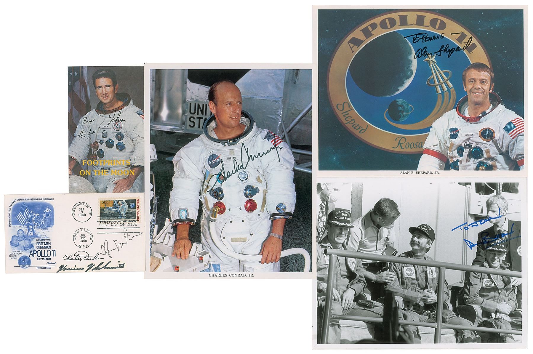 Five items signed by one or more Apollo moonwalkers: an FDC with a cachet honoring the Apollo 11 mission, signed in black ink and felt tip by Charlie Duke, Edgar Mitchell, and Harrison Schmitt; a color "Footprints on the Moon" pamphlet, 3.5 x 6, signed and inscribed in black ink by Jim Irwin; an official color 8 x 10 NASA lithograph of Charles Conrad, who signs in black felt tip; an official color 10 x 8 NASA lithograph of Alan Shepard, who signs and inscribes in black felt tip; and an official glossy 10 x 8 NASA photo of the Skylab 3 crew, signed and inscribed in blue felt tip by Alan Bean. In overall fine condition, with faint yellow haloing to the Schmitt signature.