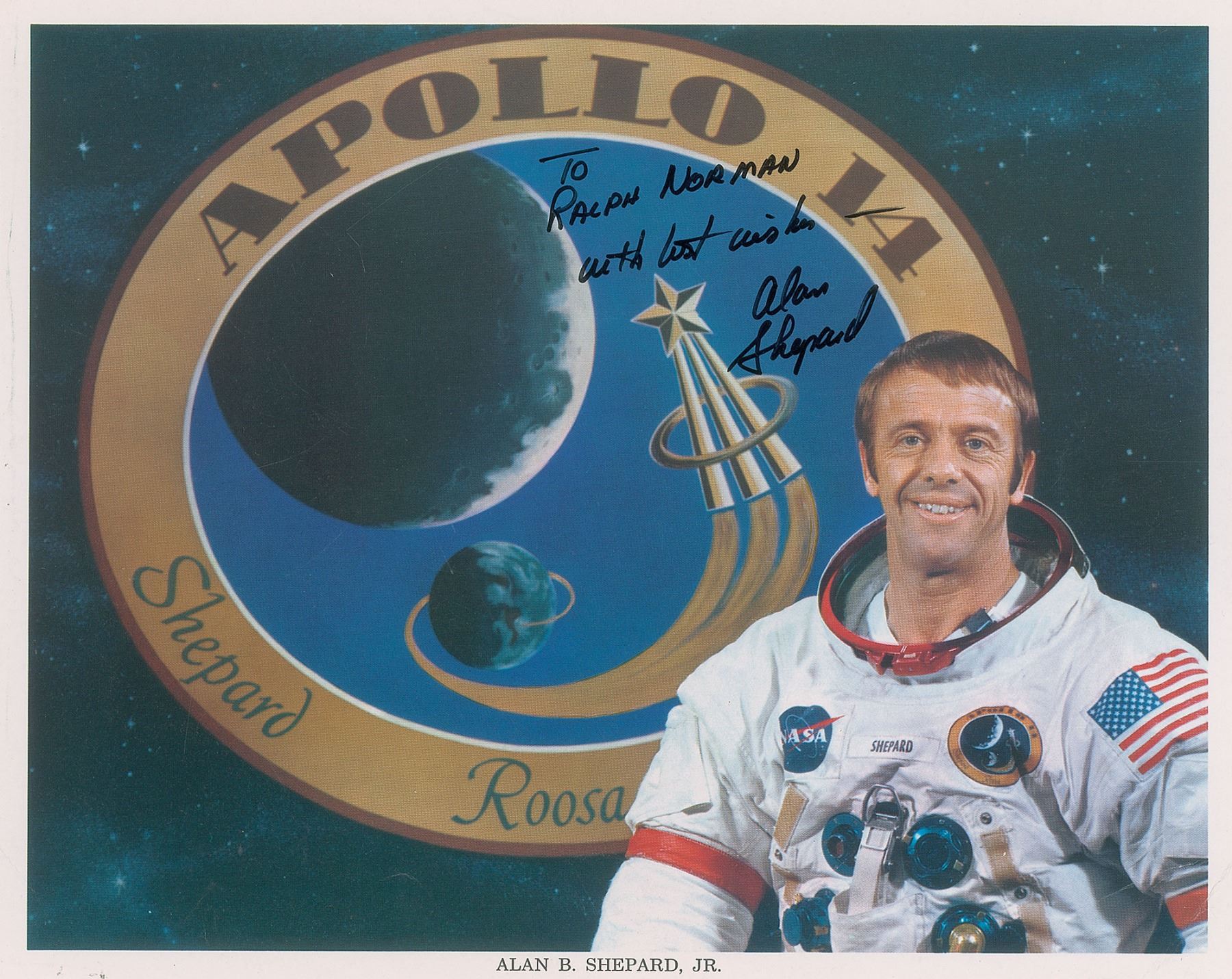 - Official NASA white space suit lithograph of Alan Shepard, signed and inscribed in black felt tip.