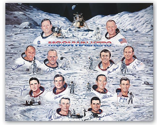 Enormous signed 31'' x 25'' color lithograph of the twelve astronauts who have flown to the moon. The late Jim Irwin was the first to sign the print in 1986 and 10 other moonwalkers have added their autographs over the years. All six lunar landings are represented by the 11 moonwalkers who have signed this print: Buzz Aldrin, Pete Conrad, Alan Bean, Alan Shepard, Edgar Mitchell, Jim Irwin, Dave Scott, Charlie Duke, John Young, Gene Cernan and Jack Schmitt. The remaining moonwalker, Neil Armstrong is the scarcest autograph, but is still alive. Lithograph was painted by artist Ron Lewis, in an edition of 1,000, signed and numbered. Printed on acid-free, very heavy stock in pristine condition. Each portrait was done from the astronaut's NASA white space suit portrait, and beside each bust is a small vignette of the astronaut in action (Conrad with Surveyor, Shepard's chip shot, etc.). Three of the astronauts who signed, including the first man in space, Alan Shepard; the third man on the moon, Charles Conrad; and James Irwin, have passed away. Due to their deaths, hardly any material exists bearing the autographs of all of these astronauts.