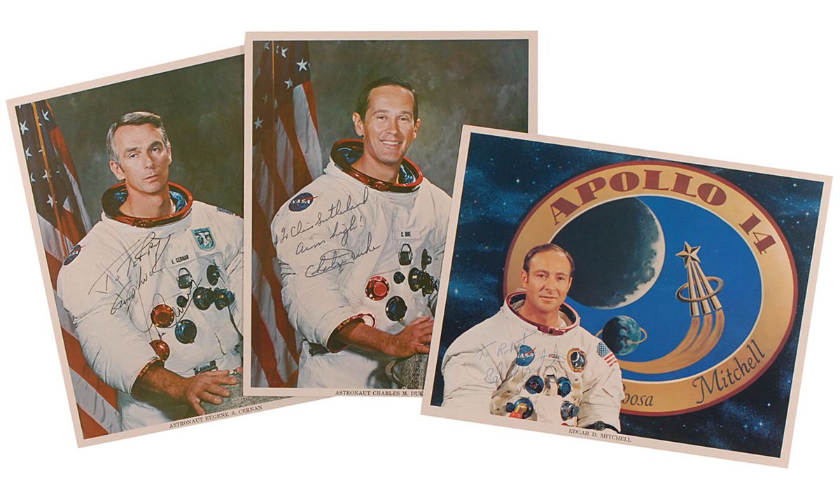 Three color NASA photos: one 8 x 10 photo of Gene Cernan in his white space suit, signed and inscribed in black felt tip; one 10 x 8 photo of Edgar Mitchell in front of the Apollo 14 emblem, signed and inscribed in blue ballpoint; and one 8 x 10 photo of Charlie Duke in his white space suit, signed and inscribed in black felt tip. In overall fine condition.