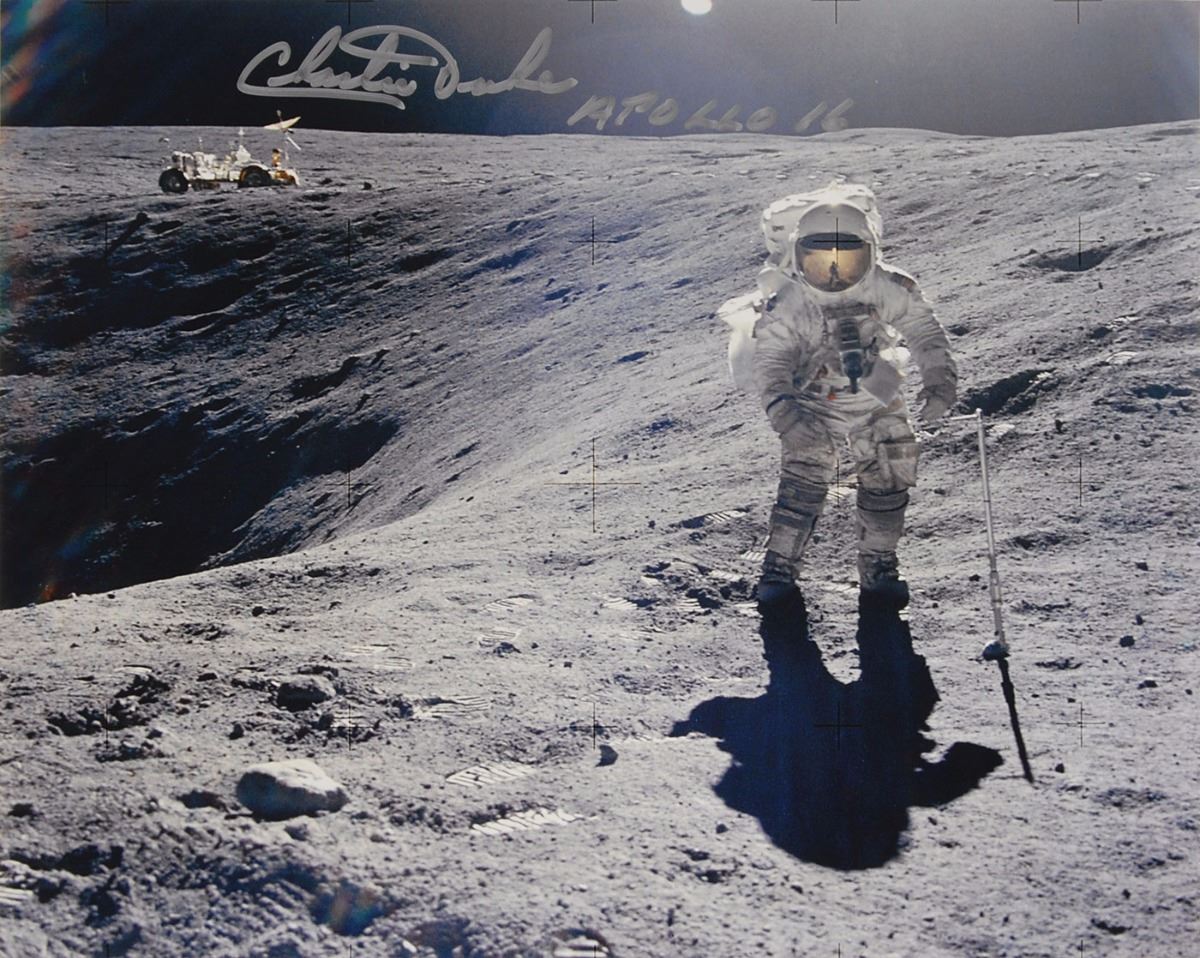 Three color satin-finish 10 x 8 photos individually signed in silver or gold ink by the Apollo astronaut pictured, including: “Buzz Aldrin,” “Charlie Duke, Apollo 16,” and “Antares, Edgar Mitchell, Apollo 14.” In overall fine condition.