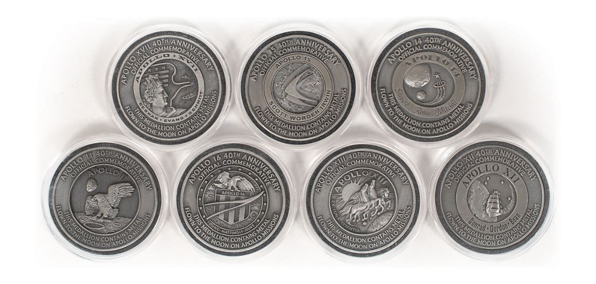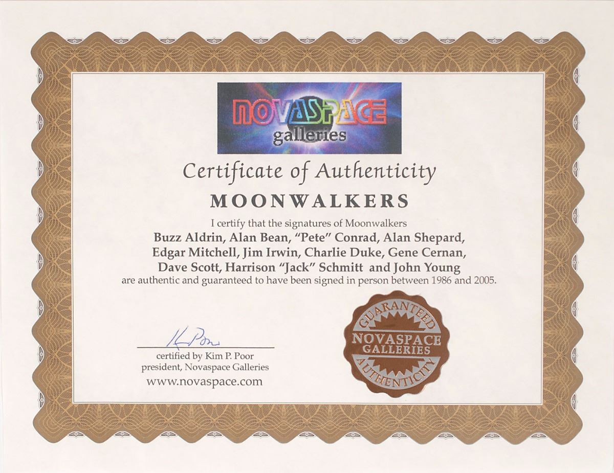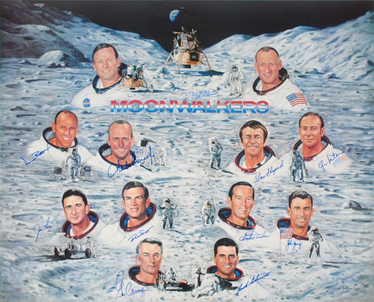 Choice color limited edition 31 x 25 print entitled ‘Moonwalkers,’ numbered 452/1000, signed in blue felt tip by eleven of the twelve men to walk on the lunar surface: Buzz Aldrin, Alan Bean, Charles Conrad, Alan Shepard, Edgar Mitchell, Dave Scott, Jim Irwin, John Young, Charlie Duke, Gene Cernan, and Harrison Schmitt. Also signed in blue felt tip by the artist, Ron Lewis. In fine condition. A visually impressive and highly desirable piece signed by these iconic astronauts. Accompanied by a certificate of authenticity from Novaspace, as well as a set of seven official 40th anniversary medallions commemorating the manned Apollo flights, all containing metal flown to the moon during the Apollo missions.