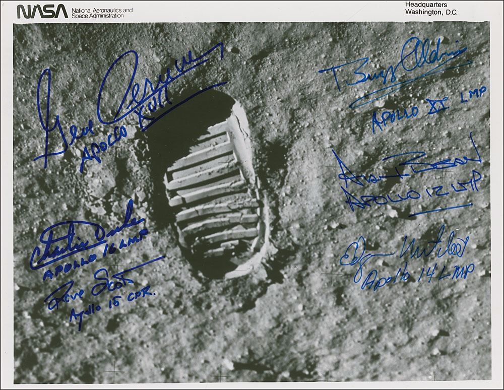 Official glossy 10.25 x 8 NASA photo of a footprint in the lunar surface, signed in blue felt tip by a moonwalker from each of the six successful moon-landing missions, including: “Gene Cernan, Apollo XVII,” “Charlie Duke, Apollo 16 LMP,” “Dave Scott, Apollo 15 CDR,” “Buzz Aldrin, Apollo XI LMP,” “Alan Bean, Apollo 12 LMP,” and “Edgar Mitchell, Apollo 14 LMP.” In fine condition, with moderate contrast to the signatures against the lunar background. An attractive cast of astronauts from each lunar-landing mission.