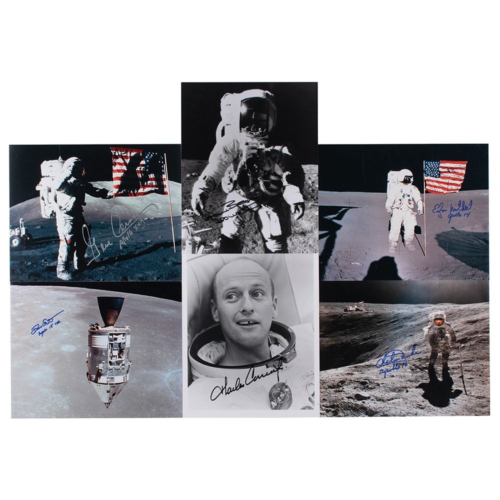 Group of six photos taken during the Apollo lunar landing missions, 8 x 10 and 10 x 8, each signed in felt tip or ink by a moonwalker, most adding their mission below. Includes: Alan Bean, Charles Conrad, Edgar Mitchell, Dave Scott, Charlie Duke, and Gene Cernan. In overall fine condition.