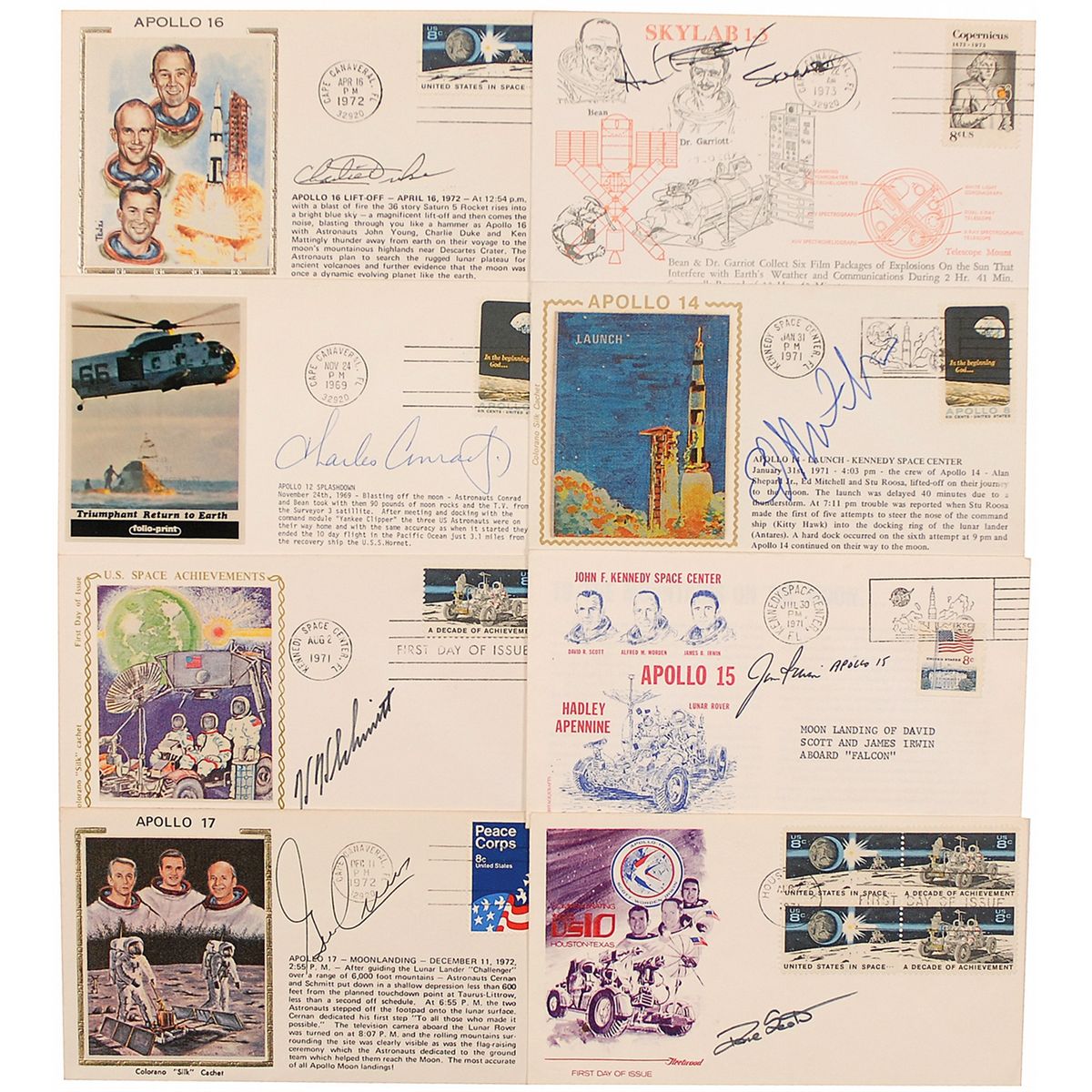 Collection of eight FDCs and commemorative covers, each with different cachets, including several affixed color cachets, each signed in ink or felt tip by a different moonwalker. Signers are: Alan Bean, Ed Mitchell, Harrison Schmitt, Jim Iwrin, Dave Scott, Charlie Duke, Charles Conrad, and Gene Cernan. In fine condition, some mild toning to edges of Mitchell’s cover.