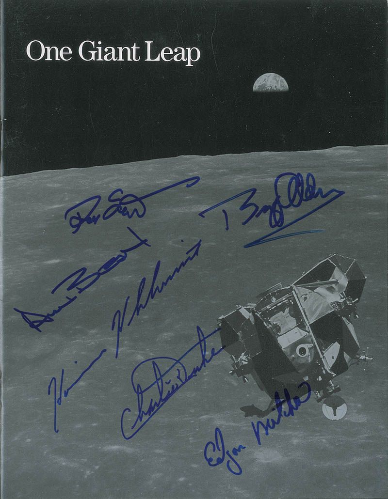 Program for One Giant Leap, The Third Annual Salute to Aviation, 8.5 x 11, 28 pages, held on September 20, 1996 at the Museum of Flying in Santa Monica, California. Signed in blue felt tip on the cover by Buzz Aldrin, Charlie Duke, Dave Scott, Alan Bean, Edgar Mitchell, and Harrison Schmitt. In fine condition. A member from each of the six lunar landings are represented on this piece.