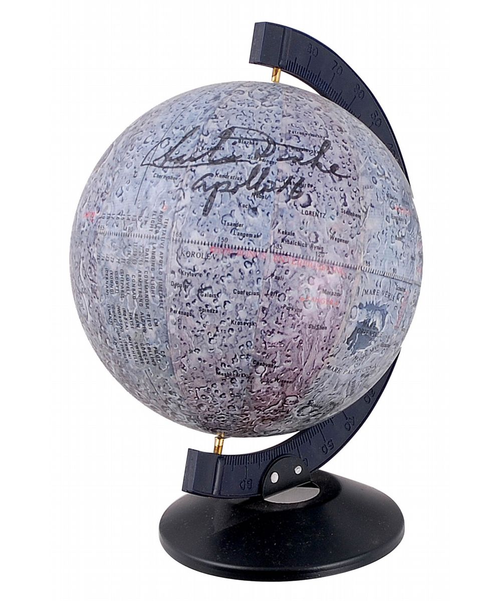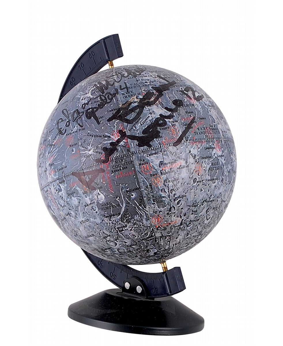 Original Apollo Moon Flights globe, made by Bonus Enterprises Inc., measuring 7? tall, signed on the globe in black felt tip, “Alan Bean Apollo 12,” “Edgar Mitchell Apollo 14,” and “Charlie Duke Apollo 16.” In fine condition. Globe comes in its original box.