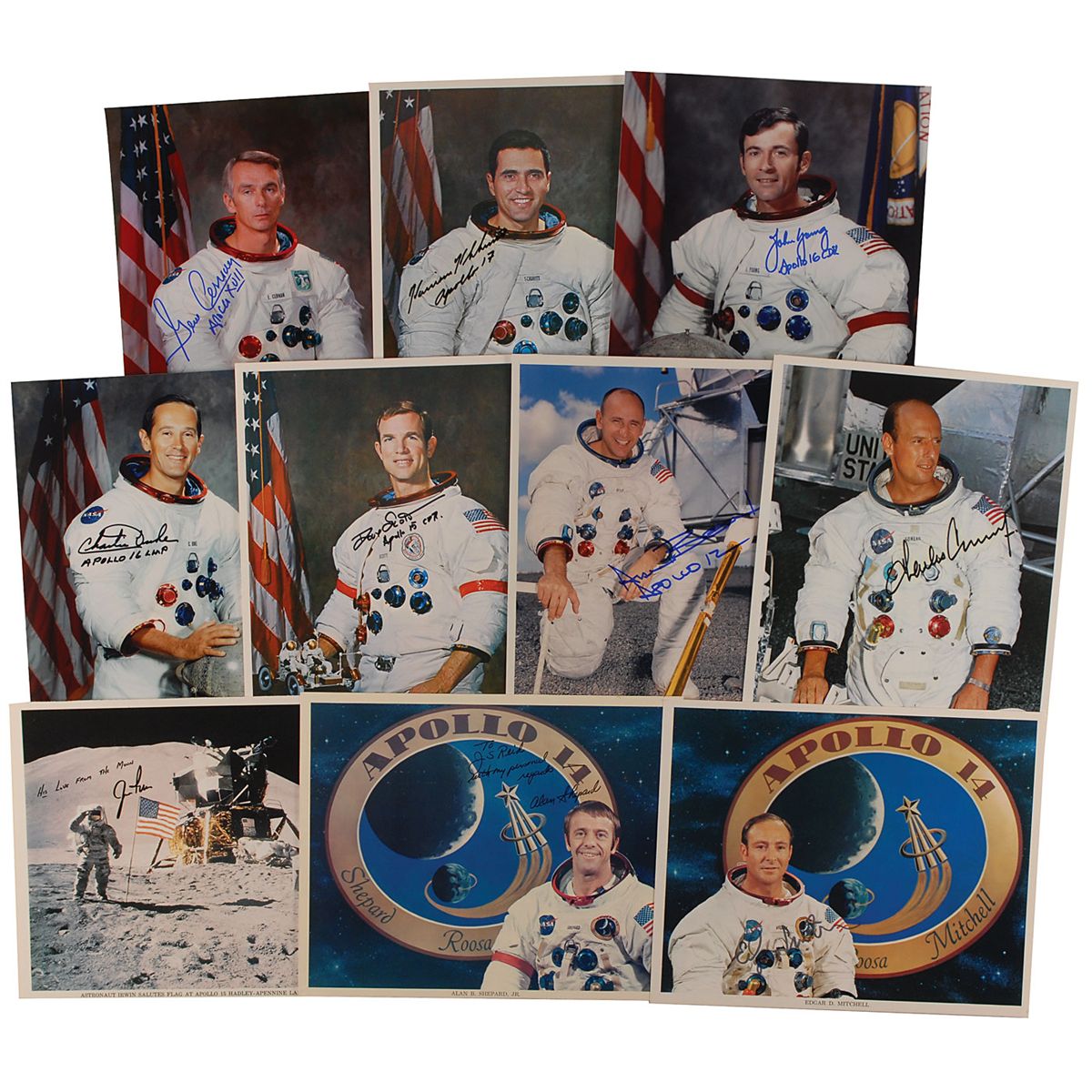 Ten color photos, various finishes, 8 x 10 and 10 x 8, each signed by the moonwalker pictured, with many adding the name of their mission. Signers are: Gene Cernan, Harrison Schmitt, John Young, Charlie Duke, Dave Scott, Jim Irwin, Edgar Mitchell, Alan Shepard (ins), Alan Bean, and Charles Conrad. In overall fine condition, with slight haloing to the Conrad and Schmitt signatures.