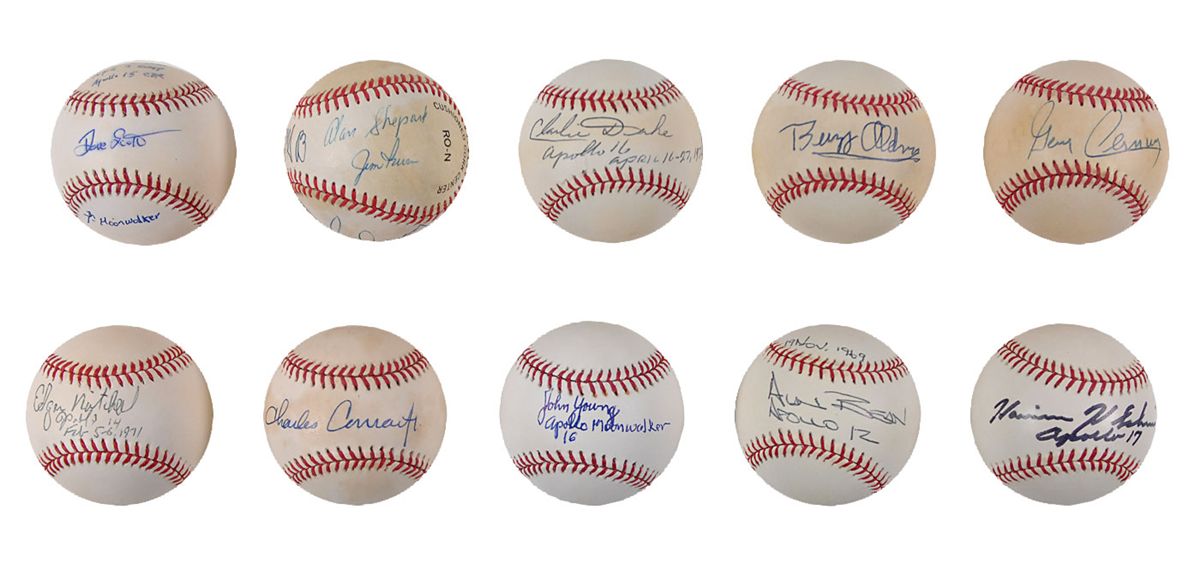 Collection of ten official Rawlings baseballs, nine single-signed and one multi-signed. Single-signed balls are signed on the sweet spot in ballpoint or felt tip by moonwalkers Buzz Aldrin, Alan Bean, Charles Conrad, Edgar Mitchell, Dave Scott, John Young, Charlie Duke, Gene Cernan, and Harrison Schmitt. Multi-signed ball is signed in ballpoint by moonwlakers Ed Mitchell (ss), Alan Shepard, Jim Irwin, Charlie Duke, Charles Conrad, and Gene Cernan. In overall very good condition, with scattered toning to most balls, with signatures remaining well-contrasted, and mild haloing to Scott’s signature. A neat collection of almost all the moonwalkers in an uncommon format.
