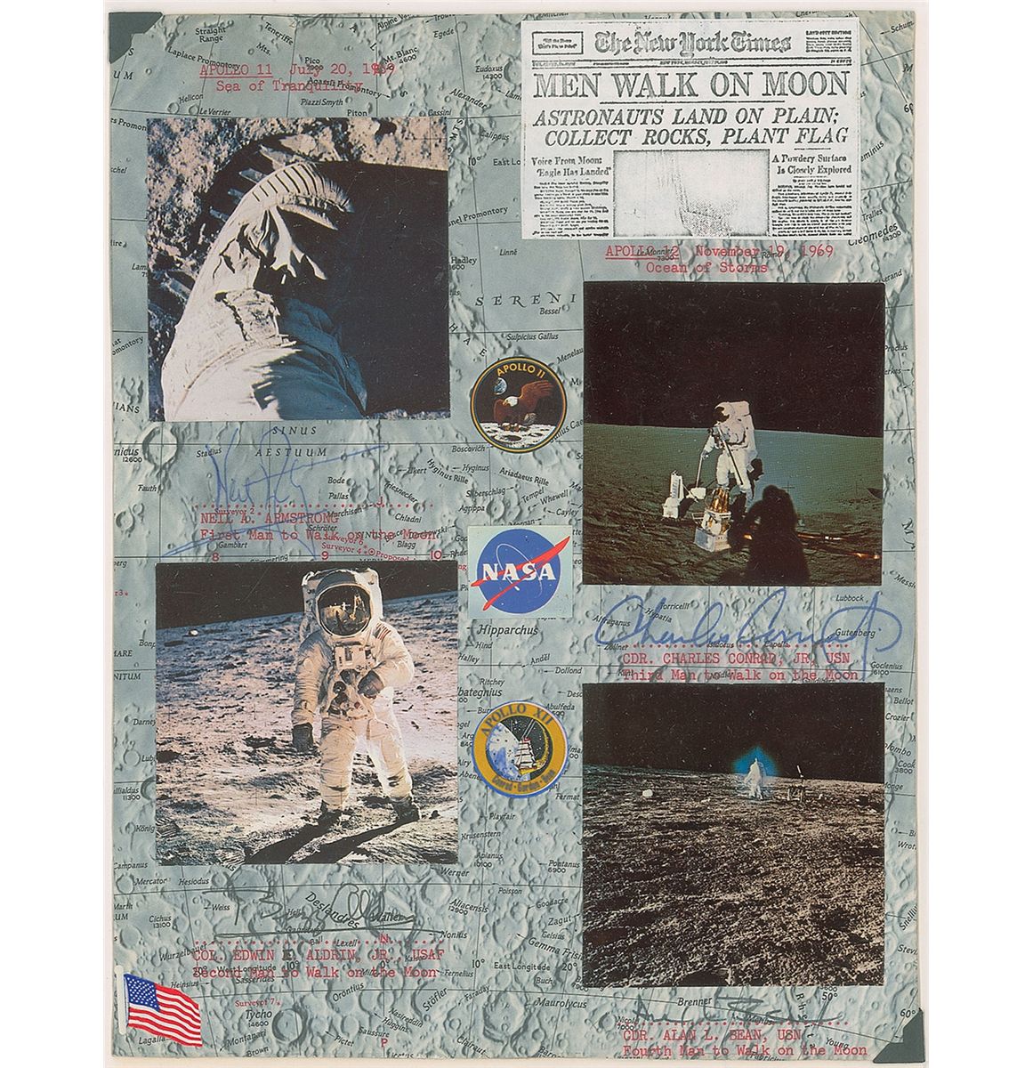 Unique collage made from an 8.25 x 10.75 color map of the moon’s surface, complete with affixed clipped photographs and mission emblems, signed in ink and felt tip by Neil Armstrong, Buzz Aldrin, Charles Conrad, and Alan Bean. In fine condition, with moderate contrast to Aldrin’s and Bean’s signatures, and light contrast to Armstrong’s signature. A unique presentation of the first four moonwalkers.