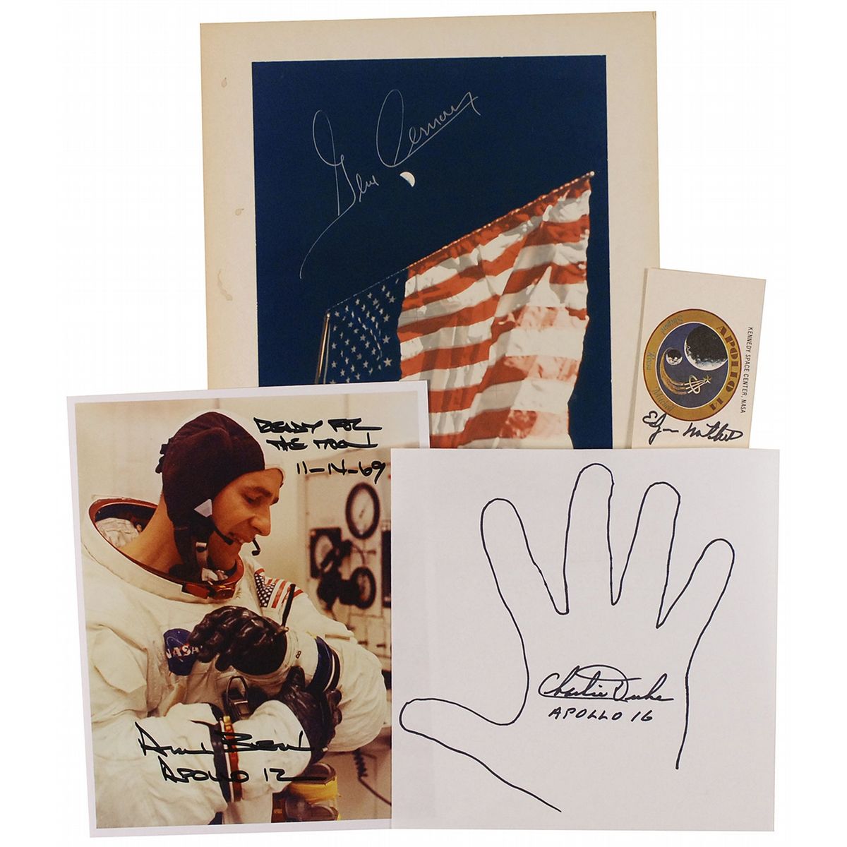 Four items: an Apollo 14 launch pass bearing the mission insignia, stamped on the reverse as number 9316, 4 x 2.5, signed vertically on the front in black felt tip by Edgar Mitchell; color glossy 7.75 x 9.75 photo of the American flag on the lunar surface affixed to its original 10 x 12 mount, signed at the top in silver ink by Gene Cernan; color satin-finish 8 x 10 photo of Alan Bean on the morning of the Apollo 12 launch, signed in black felt tip, “Ready for the moon, 11-14-69, Alan Bean, Apollo 12”; and an unusual black felt tip hand tracing on an off-white 8.5 x 8.5 sheet, signed in the center, “Charlie Duke, Apollo 16.” In overall fine condition, with some light toning and soiling to the mount of the Cernan photo.
