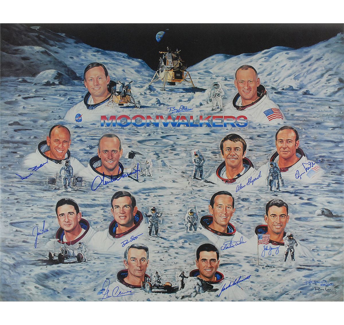 Color limited edition 31 x 25 print entitled ‘Moonwalkers,’ numbered 339/1000, signed in blue felt tip by 11 of the 12 astronauts who have walked on the surface of the moon: Buzz Aldrin, Alan Bean, Charles Conrad, Alan Shepard, Edgar Mitchell, Dave Scott, Jim Irwin, John Young, Charlie Duke, Gene Cernan, and Jack Schmitt. Also signed in blue felt tip by the artist, Ron Lewis. Rolled and in fine condition. Accompanied by a certificate of authenticity from Novaspace stating that the signatures were obtained between 1986 and 2005. A desirable presentation of moonwalkers almost 20 years in the making.