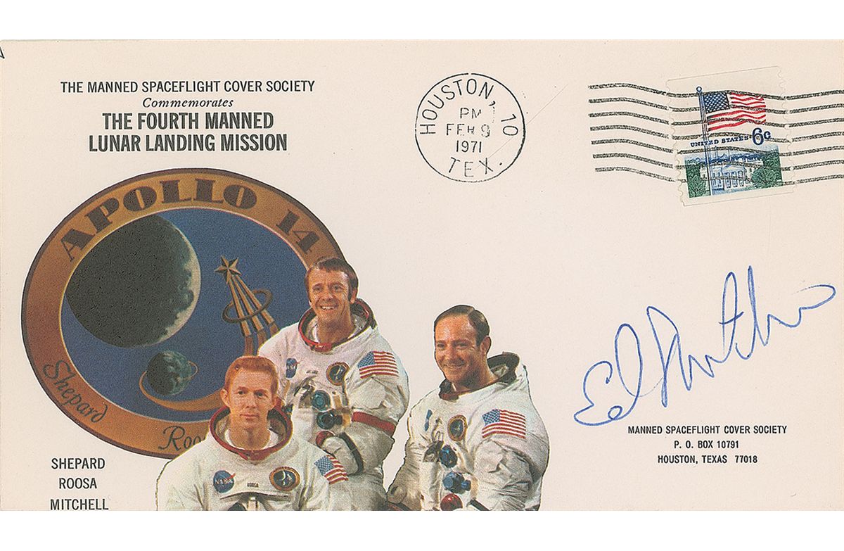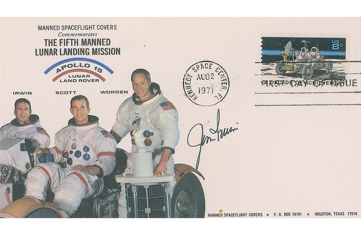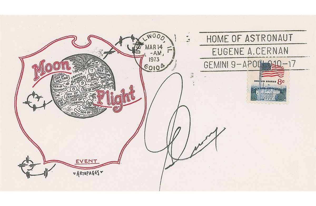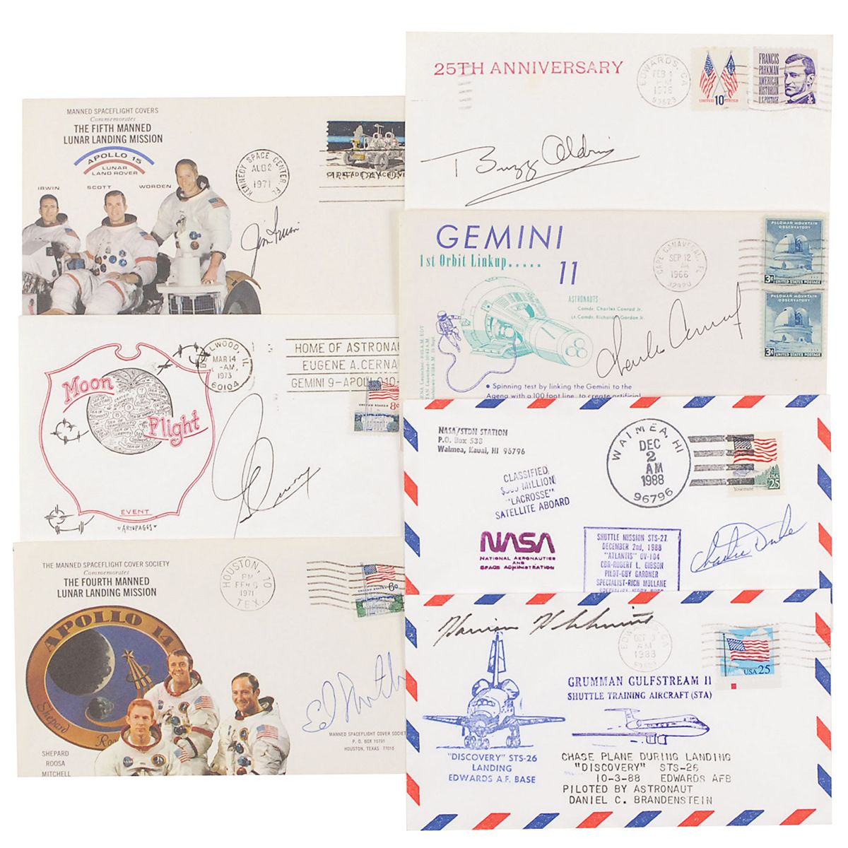 Seven commemorative covers with various cachets, each signed in felt tip or ballpoint by a moonwalker, including: Edgar Mitchell, Buzz Aldrin, Gene Cernan, Harrison Schmitt, Jim Irwin, Charlie Duke, and Charles Conrad. In overall fine condition.