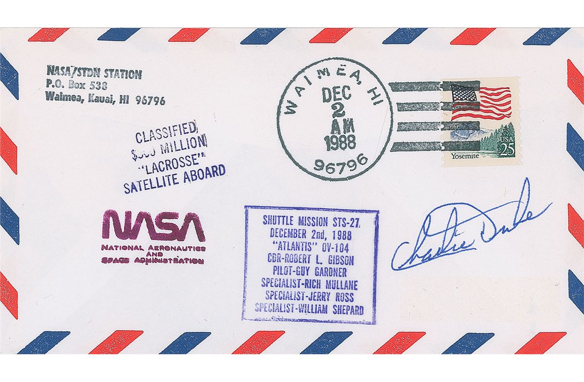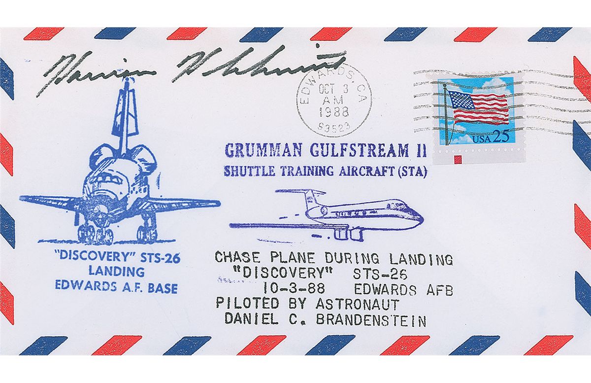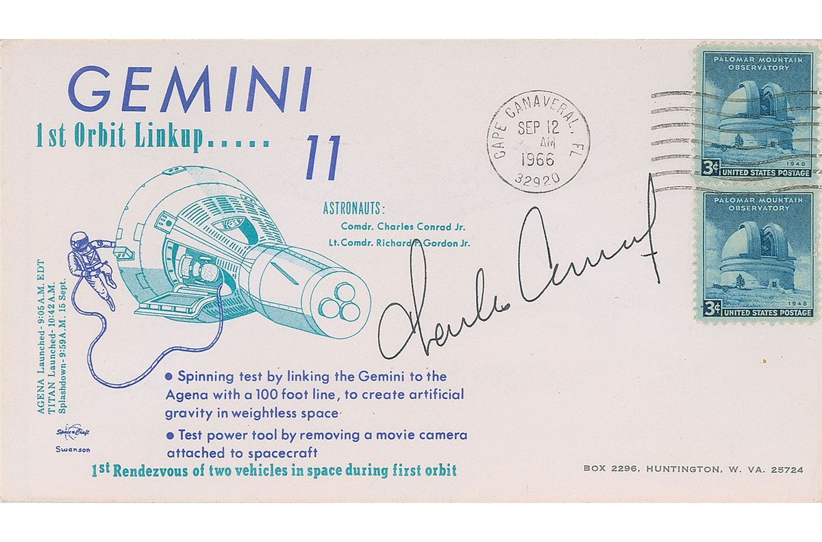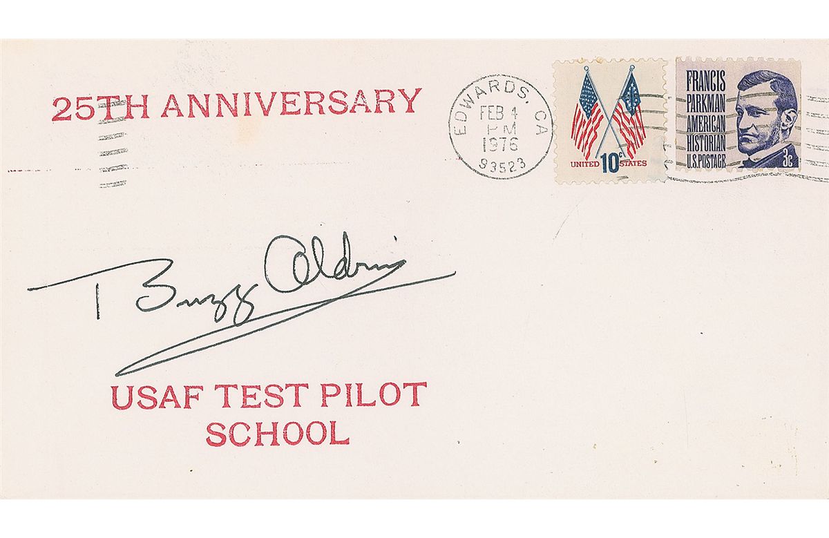 Seven commemorative covers with various cachets, each signed in felt tip or ballpoint by a moonwalker, including: Edgar Mitchell, Buzz Aldrin, Gene Cernan, Harrison Schmitt, Jim Irwin, Charlie Duke, and Charles Conrad. In overall fine condition.