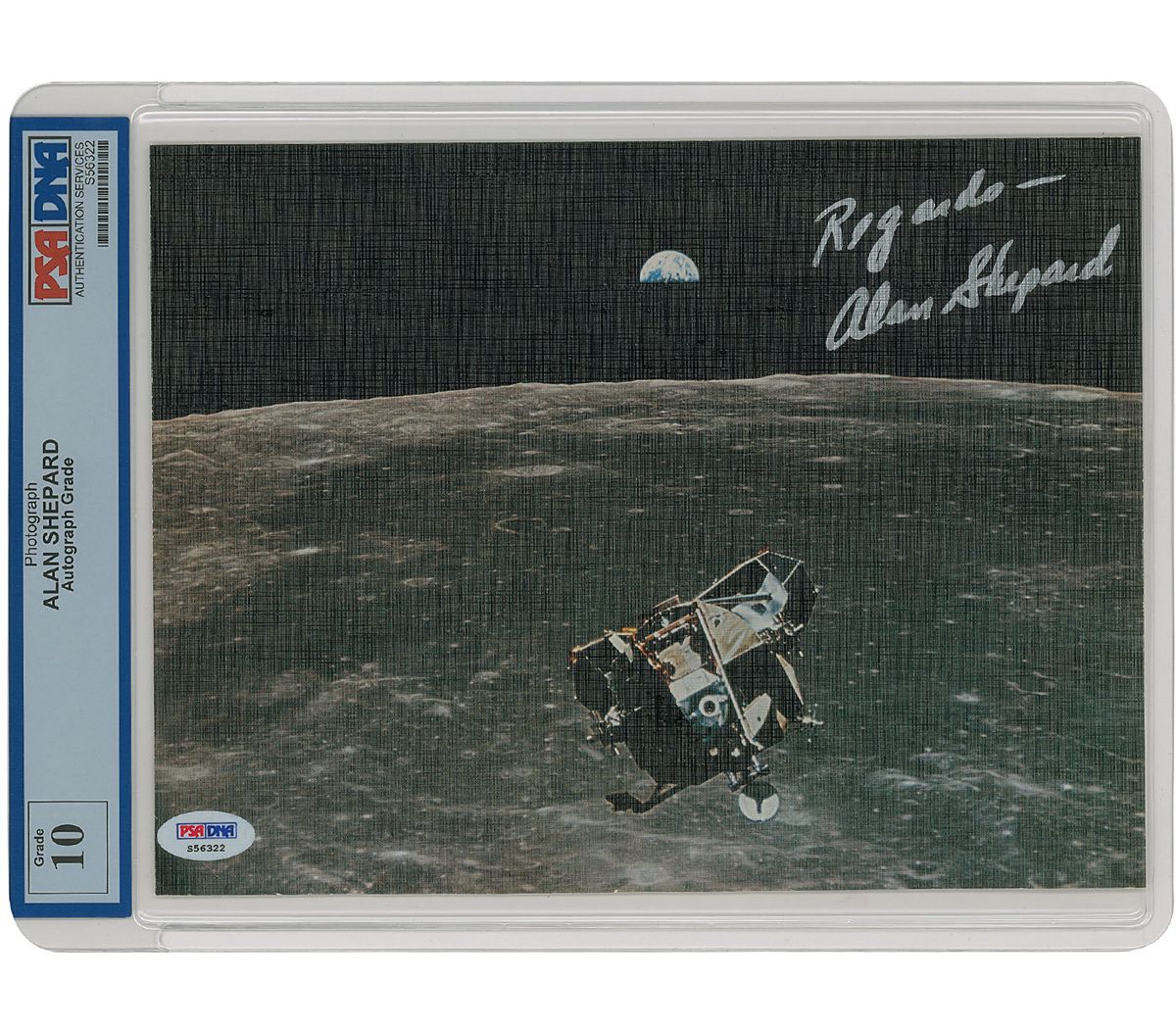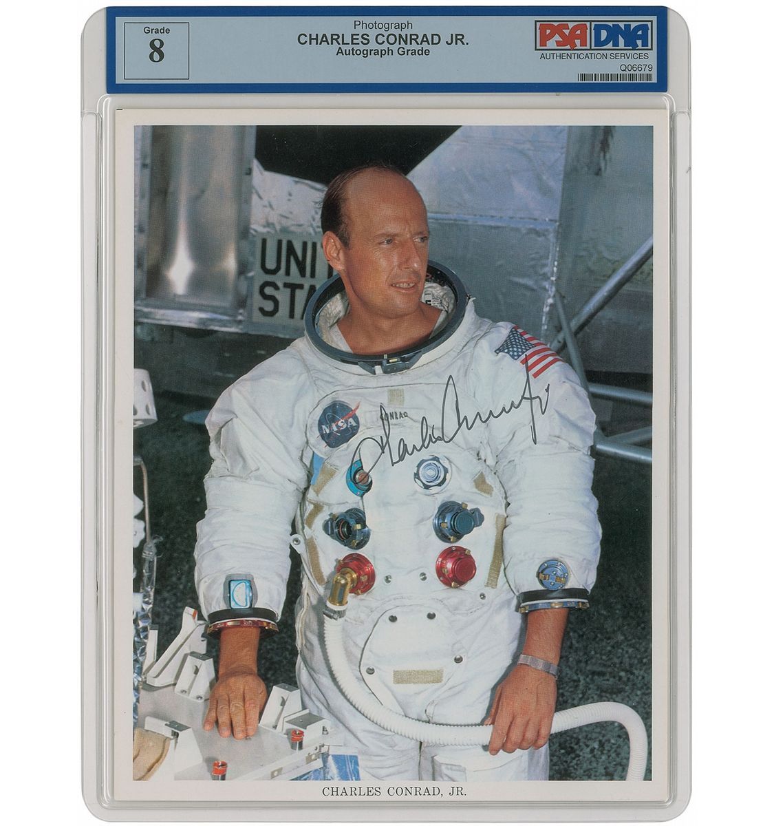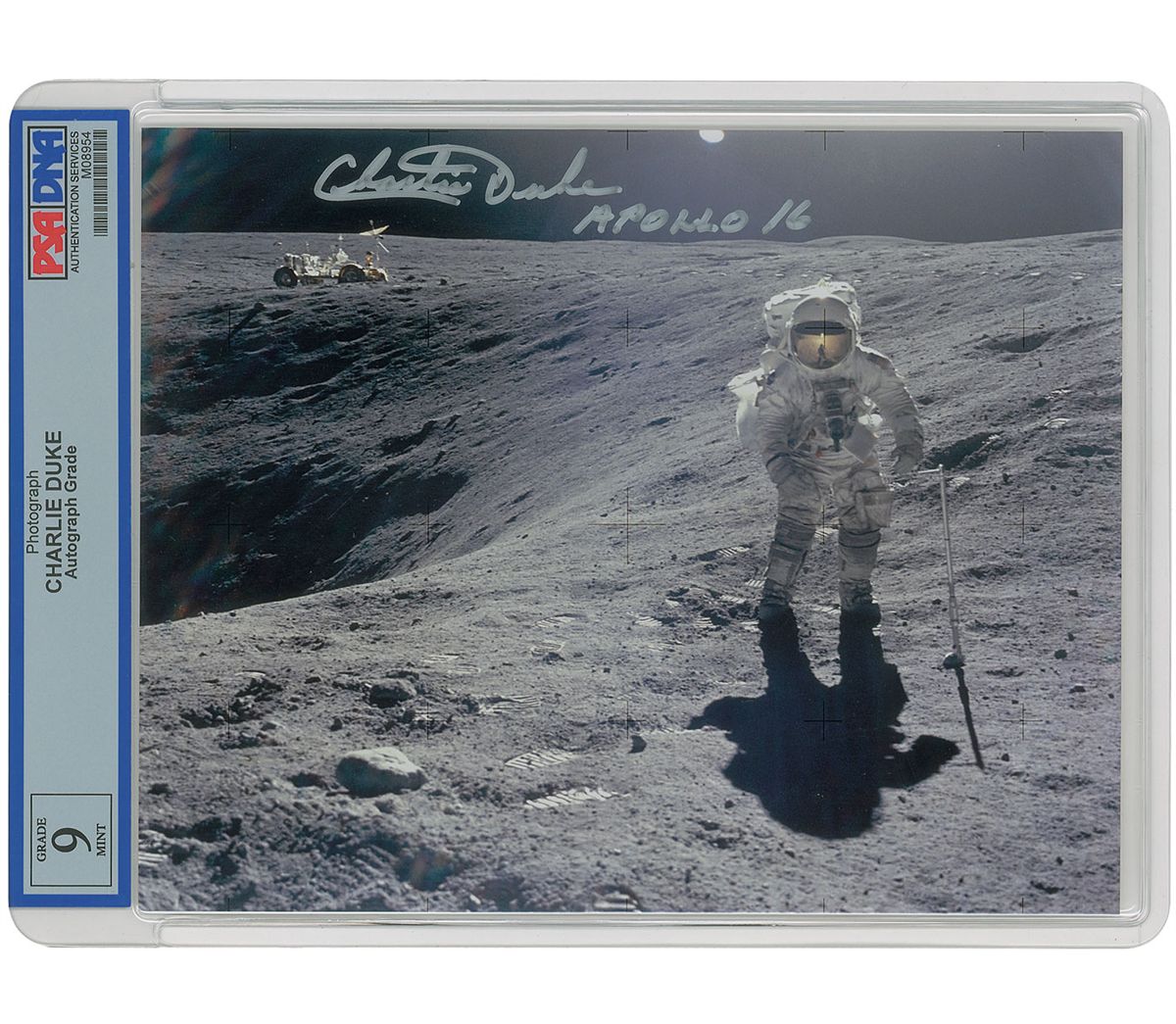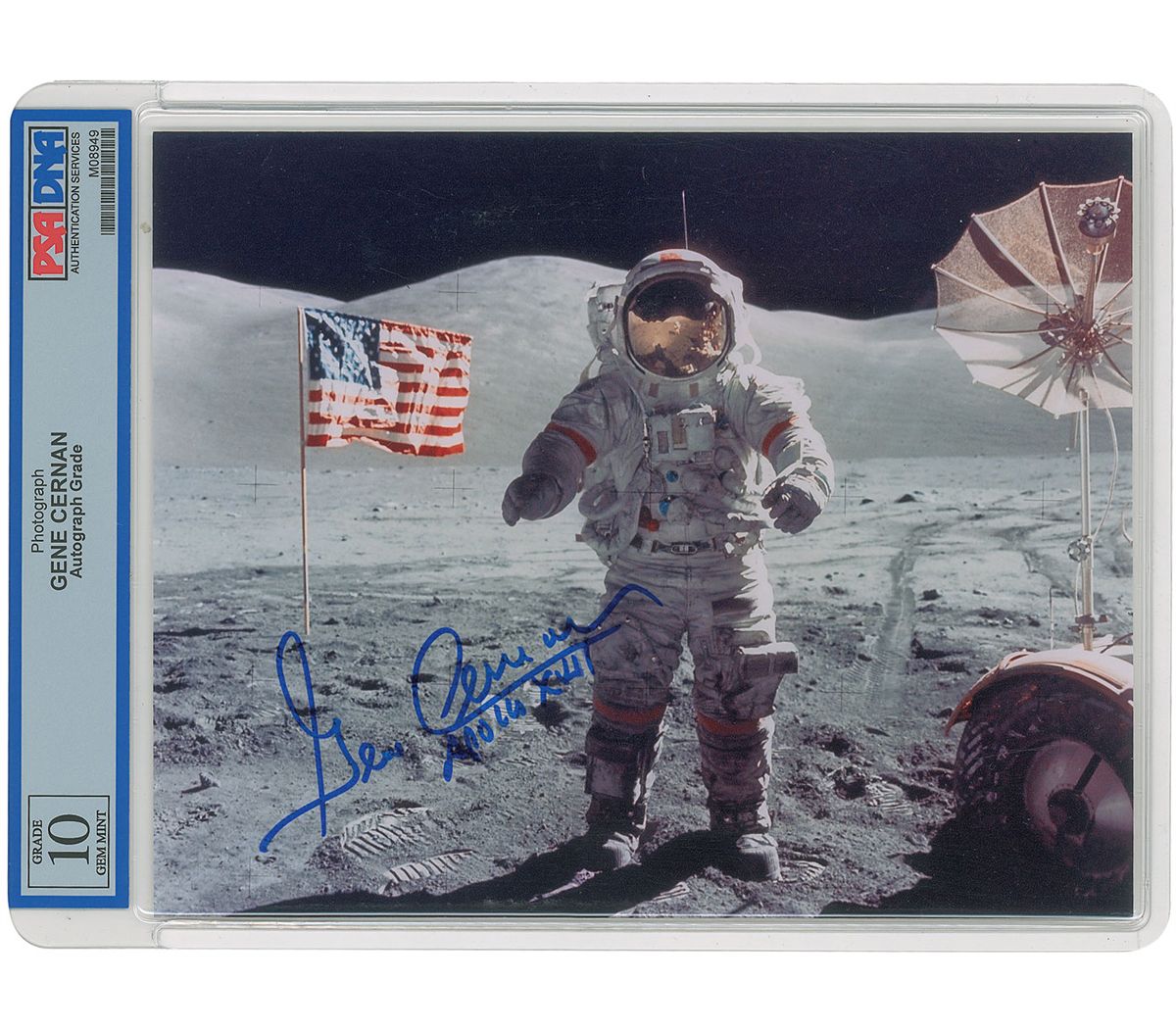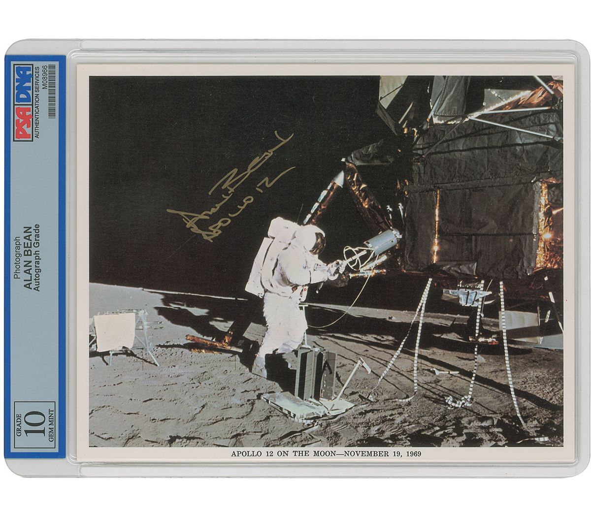 Extraordinary collection of 12 color photos representing each moonwalker, all measuring 8 x 10 or 10 x 8, each signed in felt tip or ink by the astronaut pictured. All are encapsulated in plastic PSA/DNA authentication and grading holders, evaluating just the autographic grades. Signers are: Neil Armstrong (NASA lithograph, graded "4"), Buzz Aldrin (glossy NASA 'red numbered' photo, graded "10"), Alan Bean (NASA lithograph, graded "10"), Charles Conrad (NASA lithograph, graded "8"), Alan Shepard (matte-finish photo, graded "10"), Edgar Mitchell (satin-finish photo, graded "10"), Dave Scott (satin-finish photo, graded "10"), Jim Irwin (NASA lithograph, graded "7"), John Young (satin-finish photo, graded "10"), Charlie Duke (satin-finish photo, graded "9"), Harrison Schmitt (NASA lithograph, graded "9"), and Gene Cernan (satin-finish photo, graded "10"). In overall fine condition, with a few light bends and creases to the Armstrong photo. All photos are also accompanied by full letters of authenticity from PSA/DNA. An exceptional collection of the dozen men to set foot on the moon, infrequently offered as a complete set and in such fine condition.