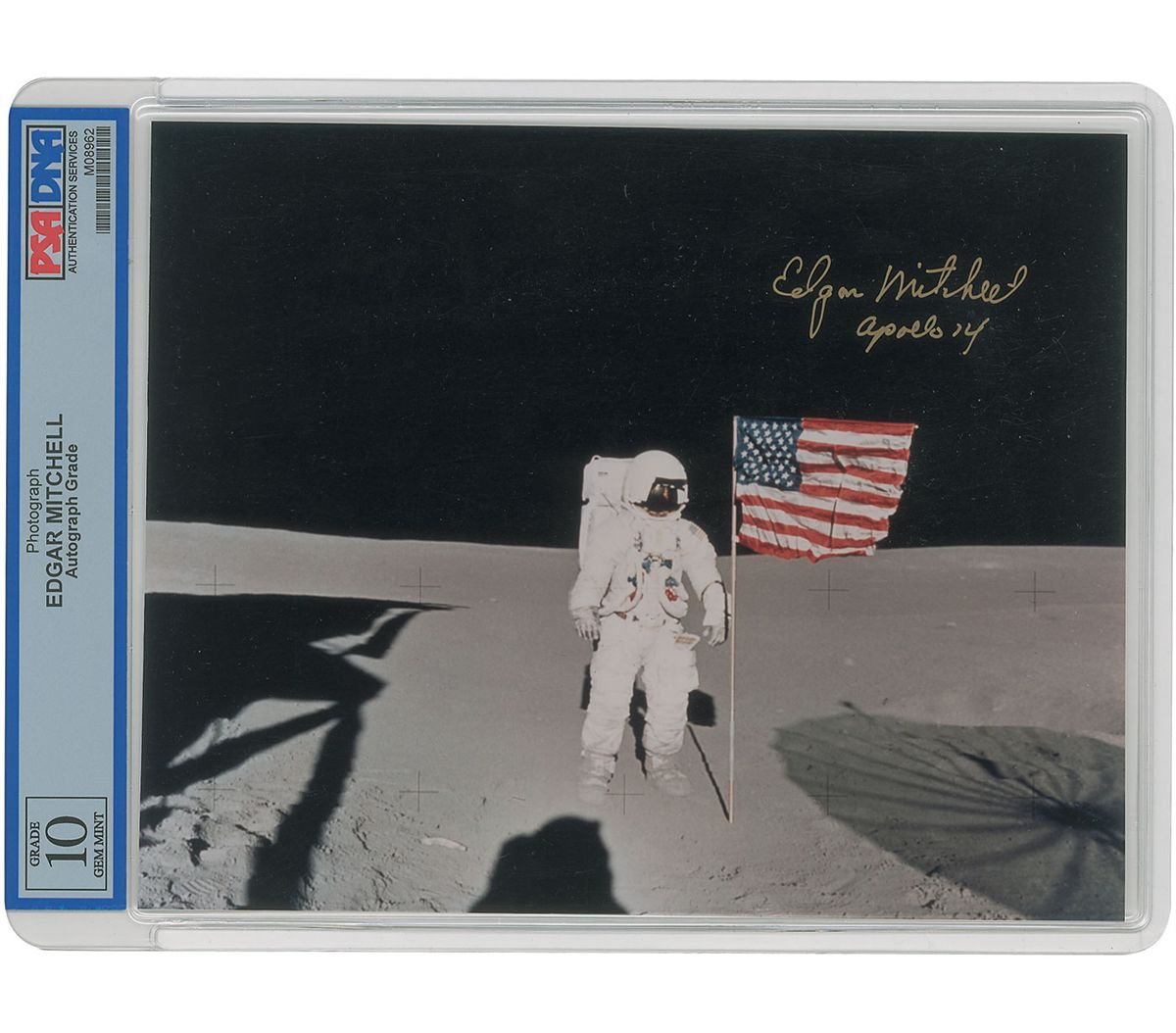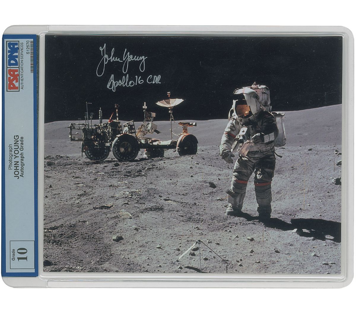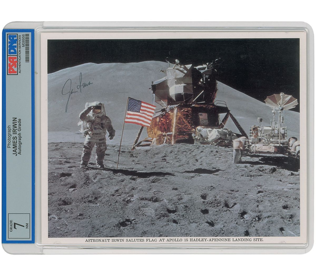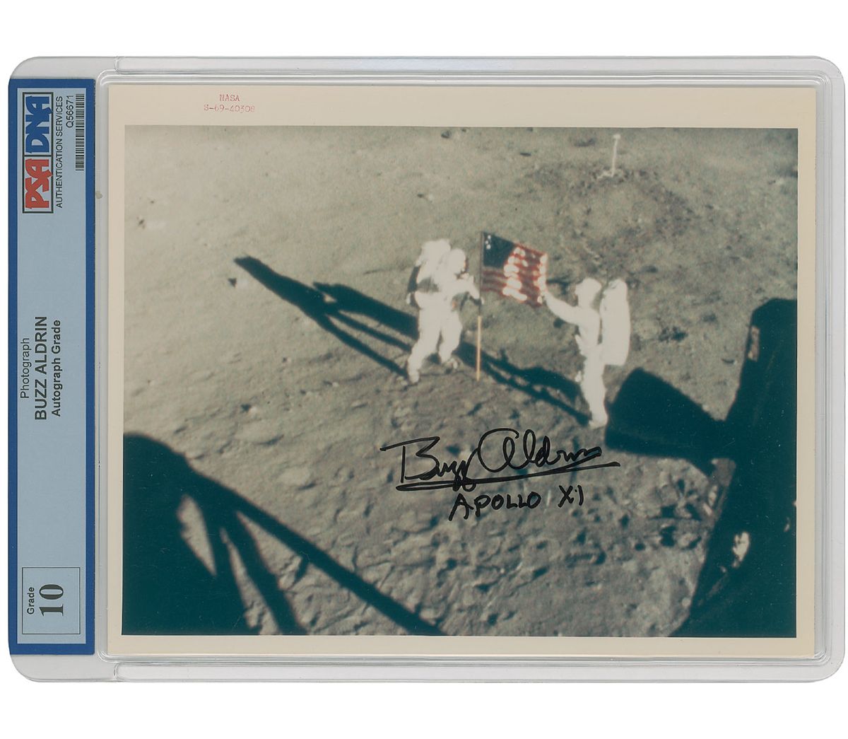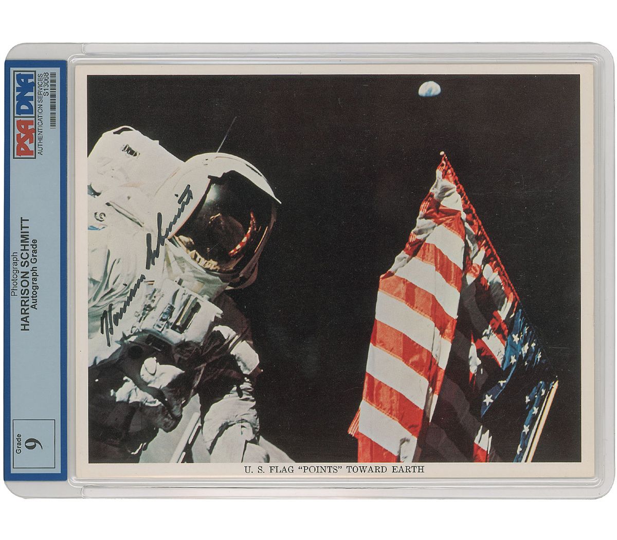 Extraordinary collection of 12 color photos representing each moonwalker, all measuring 8 x 10 or 10 x 8, each signed in felt tip or ink by the astronaut pictured. All are encapsulated in plastic PSA/DNA authentication and grading holders, evaluating just the autographic grades. Signers are: Neil Armstrong (NASA lithograph, graded "4"), Buzz Aldrin (glossy NASA 'red numbered' photo, graded "10"), Alan Bean (NASA lithograph, graded "10"), Charles Conrad (NASA lithograph, graded "8"), Alan Shepard (matte-finish photo, graded "10"), Edgar Mitchell (satin-finish photo, graded "10"), Dave Scott (satin-finish photo, graded "10"), Jim Irwin (NASA lithograph, graded "7"), John Young (satin-finish photo, graded "10"), Charlie Duke (satin-finish photo, graded "9"), Harrison Schmitt (NASA lithograph, graded "9"), and Gene Cernan (satin-finish photo, graded "10"). In overall fine condition, with a few light bends and creases to the Armstrong photo. All photos are also accompanied by full letters of authenticity from PSA/DNA. An exceptional collection of the dozen men to set foot on the moon, infrequently offered as a complete set and in such fine condition.