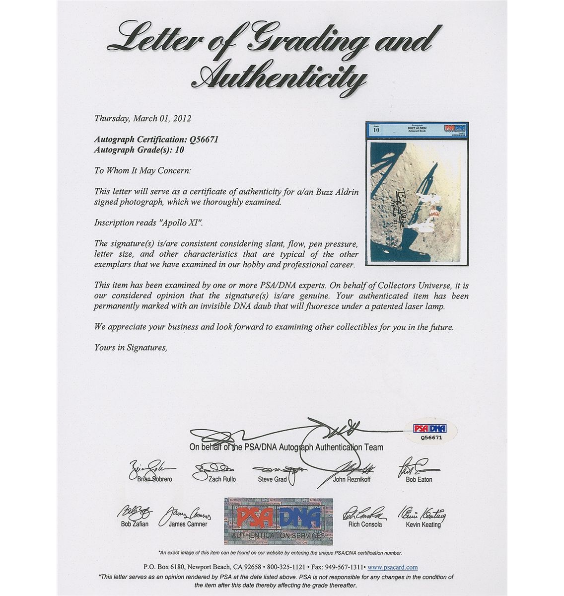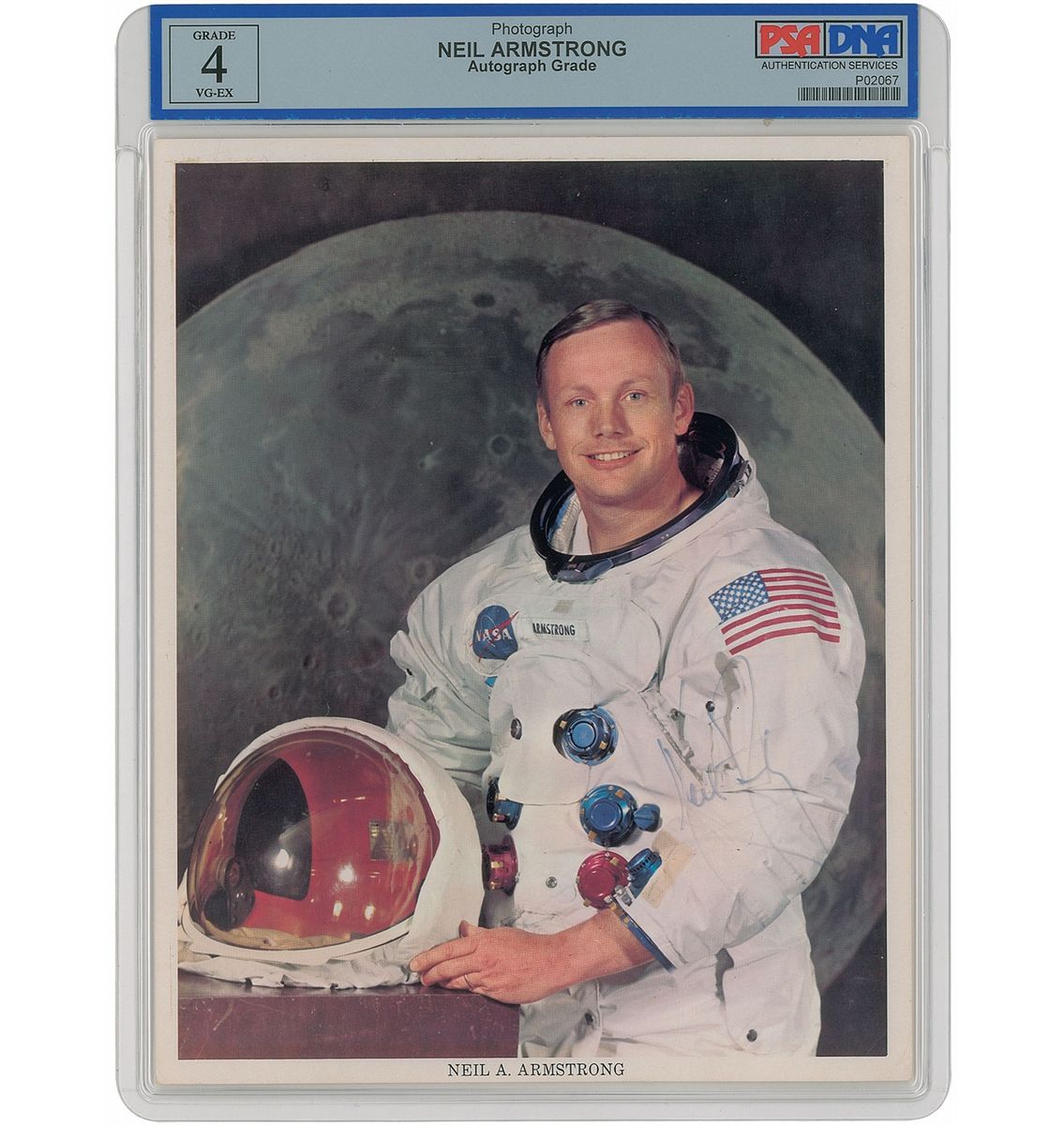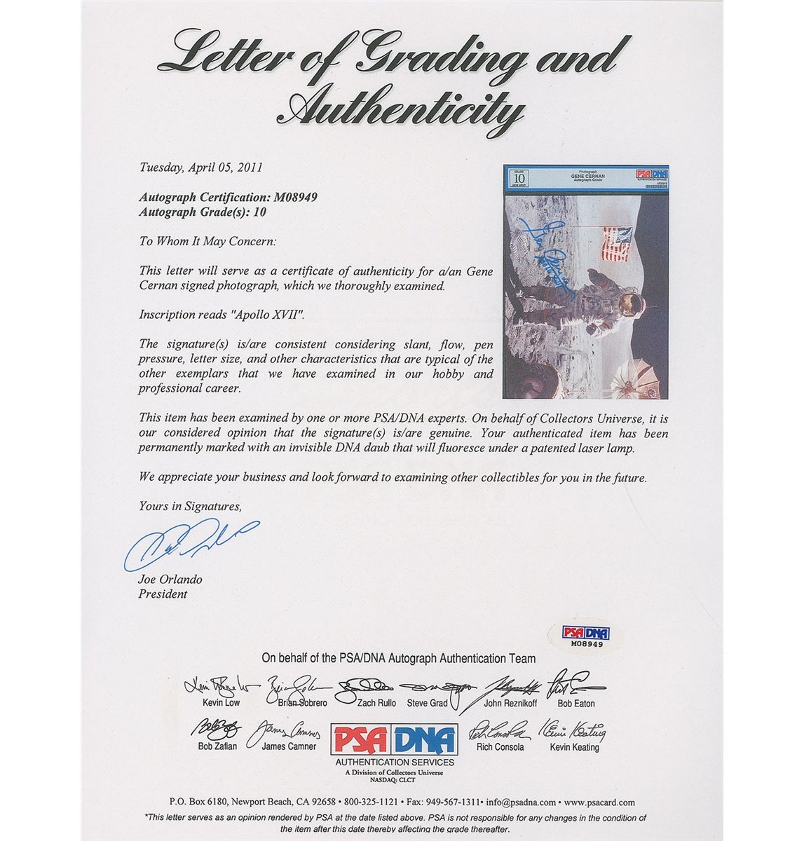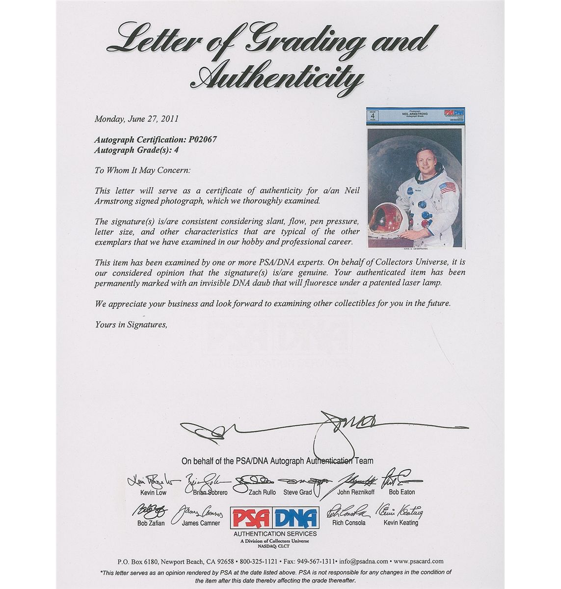 Extraordinary collection of 12 color photos representing each moonwalker, all measuring 8 x 10 or 10 x 8, each signed in felt tip or ink by the astronaut pictured. All are encapsulated in plastic PSA/DNA authentication and grading holders, evaluating just the autographic grades. Signers are: Neil Armstrong (NASA lithograph, graded "4"), Buzz Aldrin (glossy NASA 'red numbered' photo, graded "10"), Alan Bean (NASA lithograph, graded "10"), Charles Conrad (NASA lithograph, graded "8"), Alan Shepard (matte-finish photo, graded "10"), Edgar Mitchell (satin-finish photo, graded "10"), Dave Scott (satin-finish photo, graded "10"), Jim Irwin (NASA lithograph, graded "7"), John Young (satin-finish photo, graded "10"), Charlie Duke (satin-finish photo, graded "9"), Harrison Schmitt (NASA lithograph, graded "9"), and Gene Cernan (satin-finish photo, graded "10"). In overall fine condition, with a few light bends and creases to the Armstrong photo. All photos are also accompanied by full letters of authenticity from PSA/DNA. An exceptional collection of the dozen men to set foot on the moon, infrequently offered as a complete set and in such fine condition.